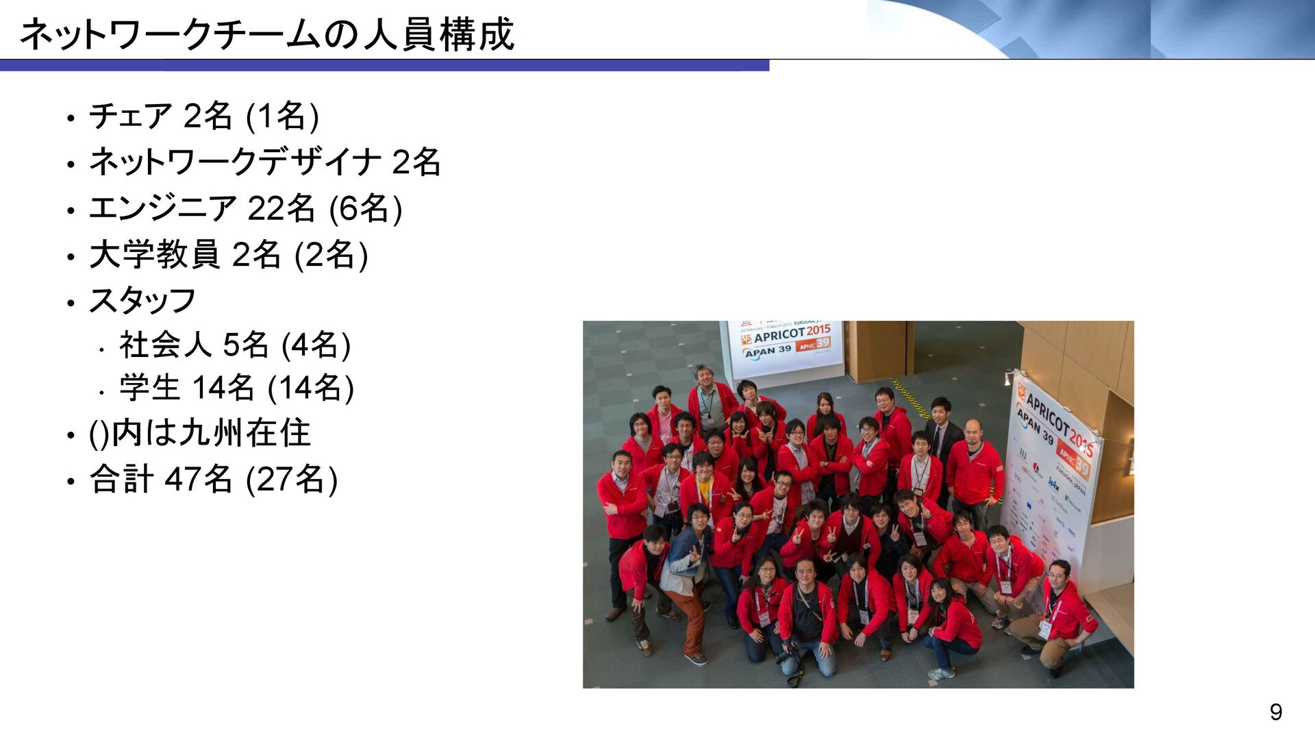 ネットワークチームの人員構成 • チェア 2名 (1名) • ネットワークデザイナ 2名 • エンジニア