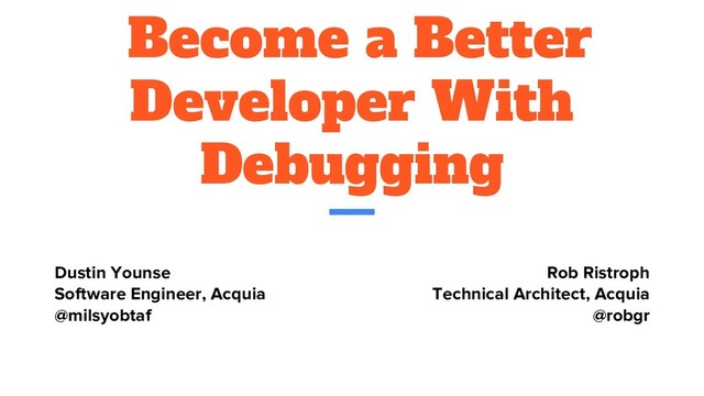 In this session, we will be going over useful debugging tools and techniques that can help you start to see into the inner workings of all versions of Drupal, including the new kid on the block, Drupal 8. You will be better prepared to start building truly custom features into your projects and you’ll be able to remain calm when you get the ineveitable email that your site is showing the dreaded White Screen Of Death at 4:45pm on a Friday afternoon.