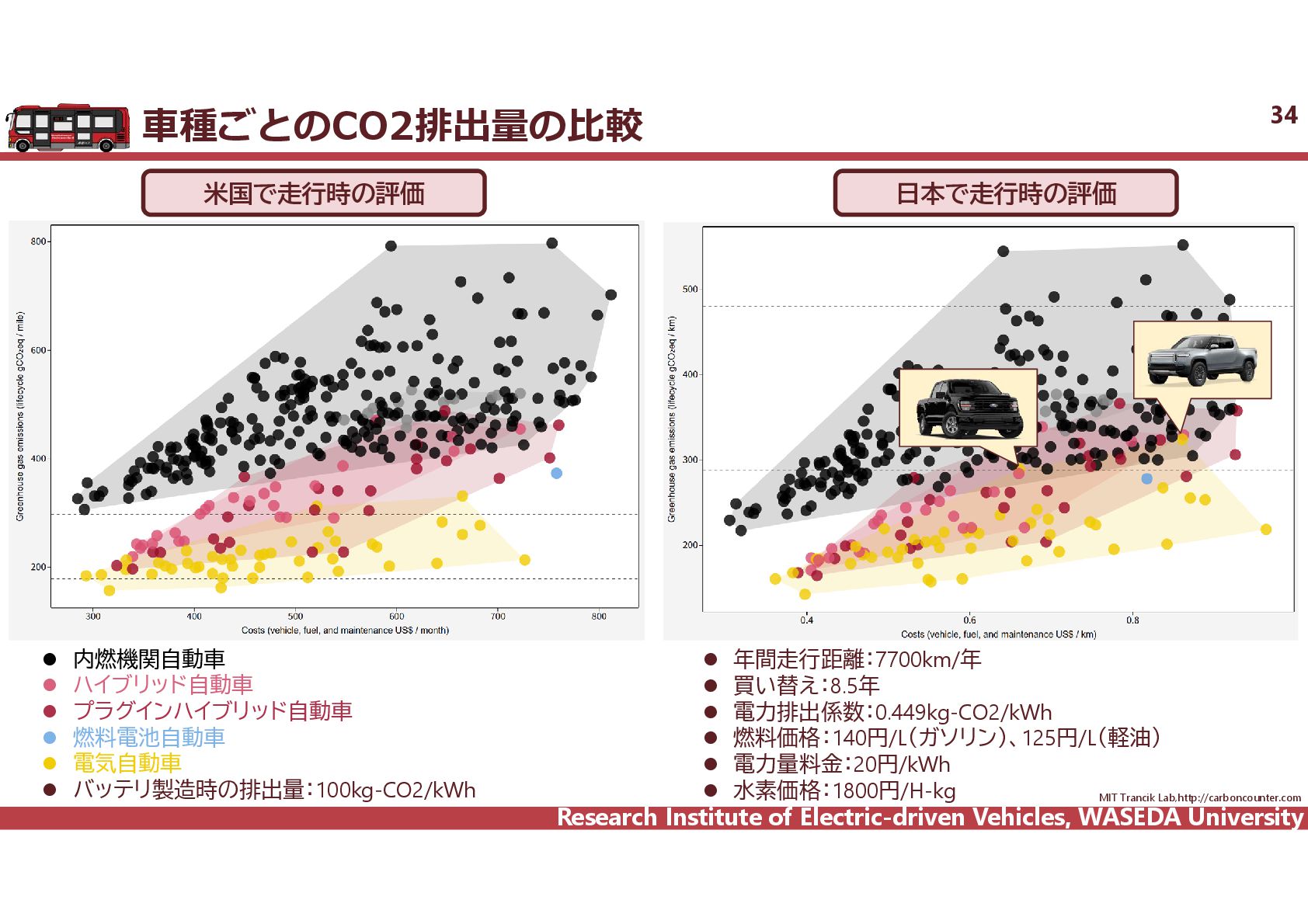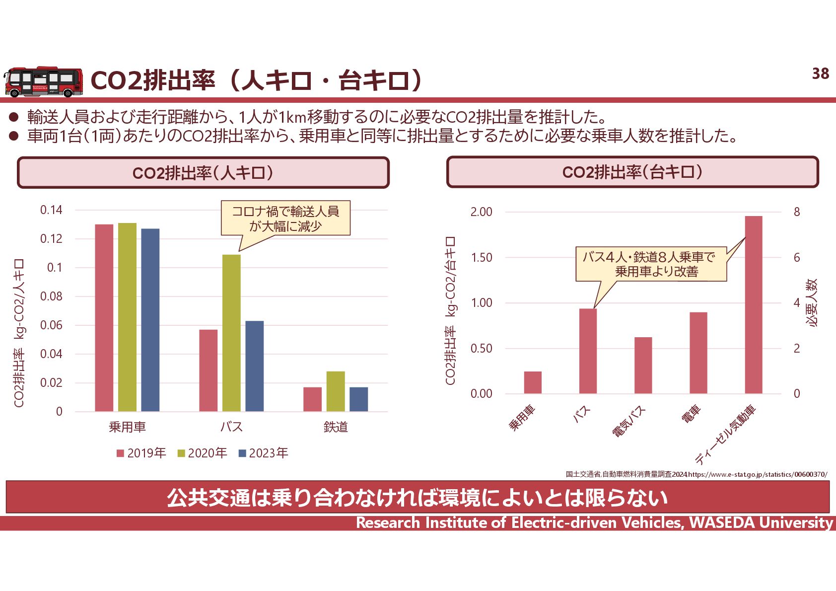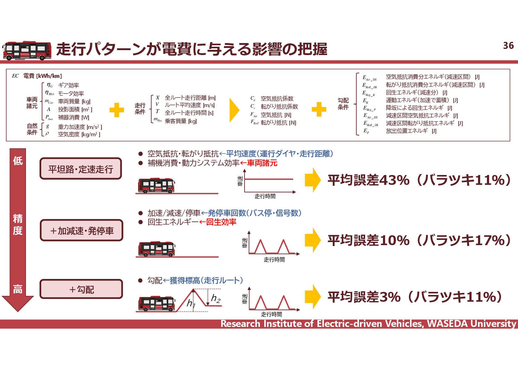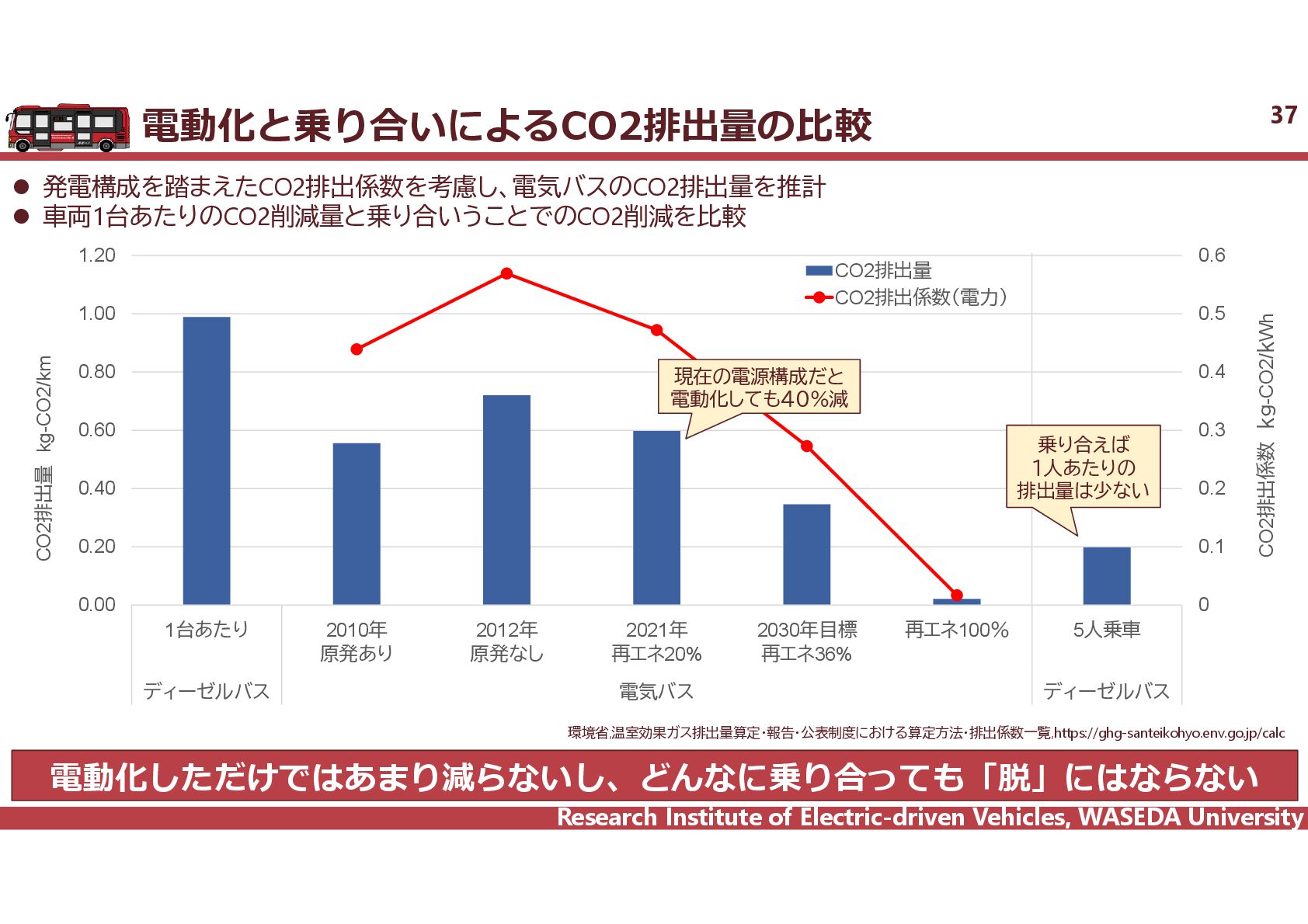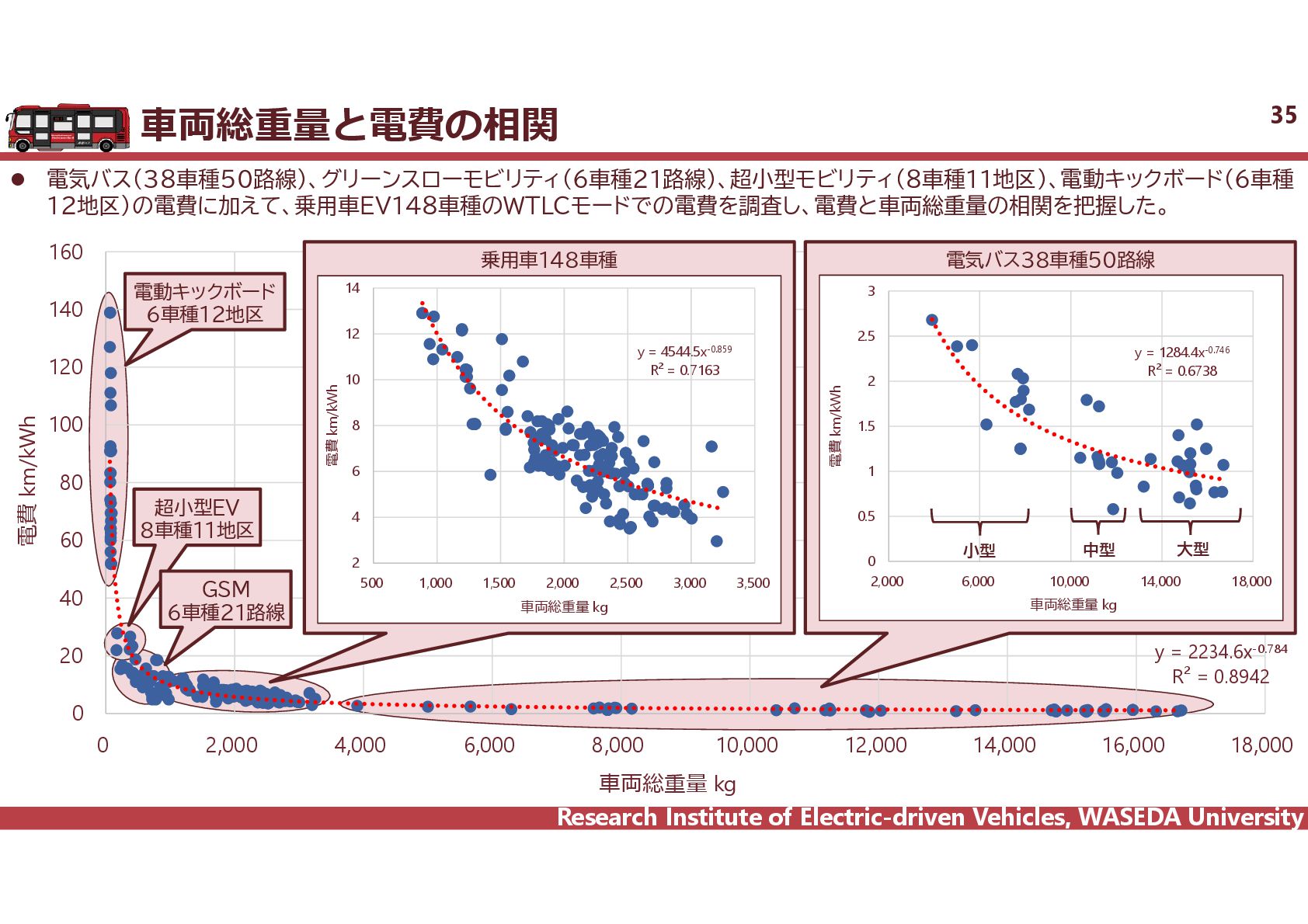 R² = 0.8942 0 20 40 60 80 100 120 140 160 0 2,000 4,000 6,000 8,000 10,000 12,000 14,000 16,000 18,000 電費 km/kWh ⾞両総重量 kg ⾞両総重量と電費の相関 35 電気バス(38車種50路線)、グリーンスローモビリティ(6車種21路線)、超小型モビリティ(8車種11地区)、電動キックボード(6車種 12地区)の電費に加えて、乗用車EV148車種のWTLCモードでの電費を調査し、電費と車両総重量の相関を把握した。 電気バス38車種50路線 電動キックボード 6車種12地区 超小型EV 8車種11地区 GSM 6車種21路線 乗用車148車種 y = 1284.4x-0.746 R² = 0.6738 0 0.5 1 1.5 2 2.5 3 2,000 6,000 10,000 14,000 18,000 電費 km/kWh ⾞両総重量 kg y = 4544.5x-0.859 R² = 0.7163 2 4 6 8 10 12 14 500 1,000 1,500 2,000 2,500 3,000 3,500 電費 km/kWh ⾞両総重量 kg 小型 中型 大型