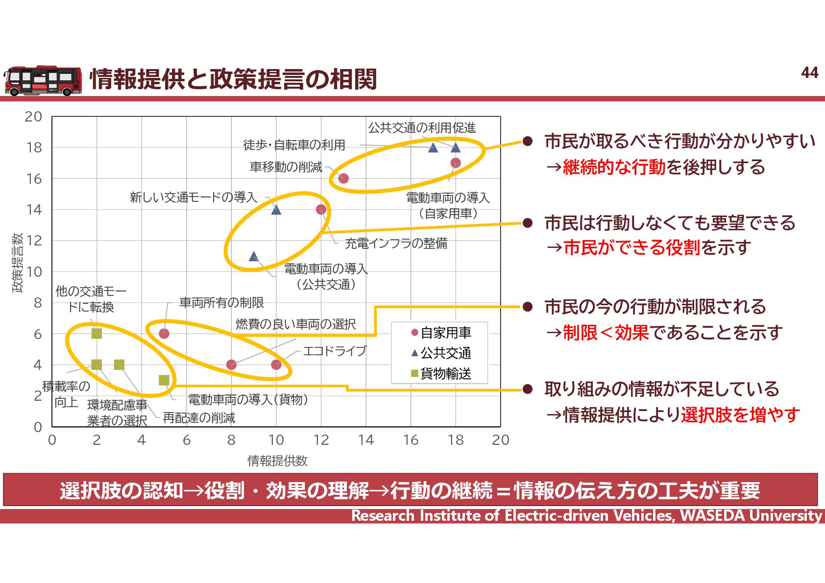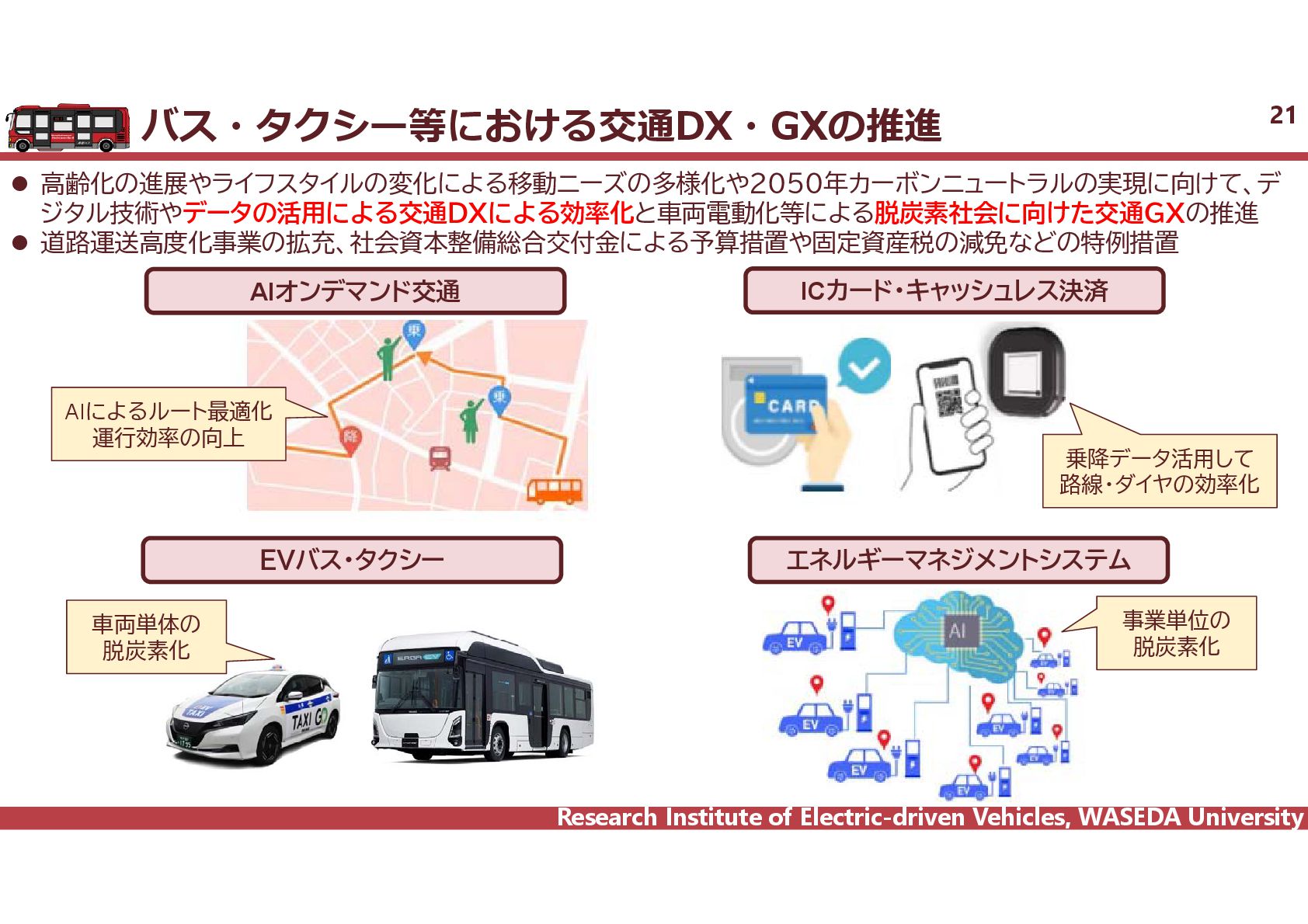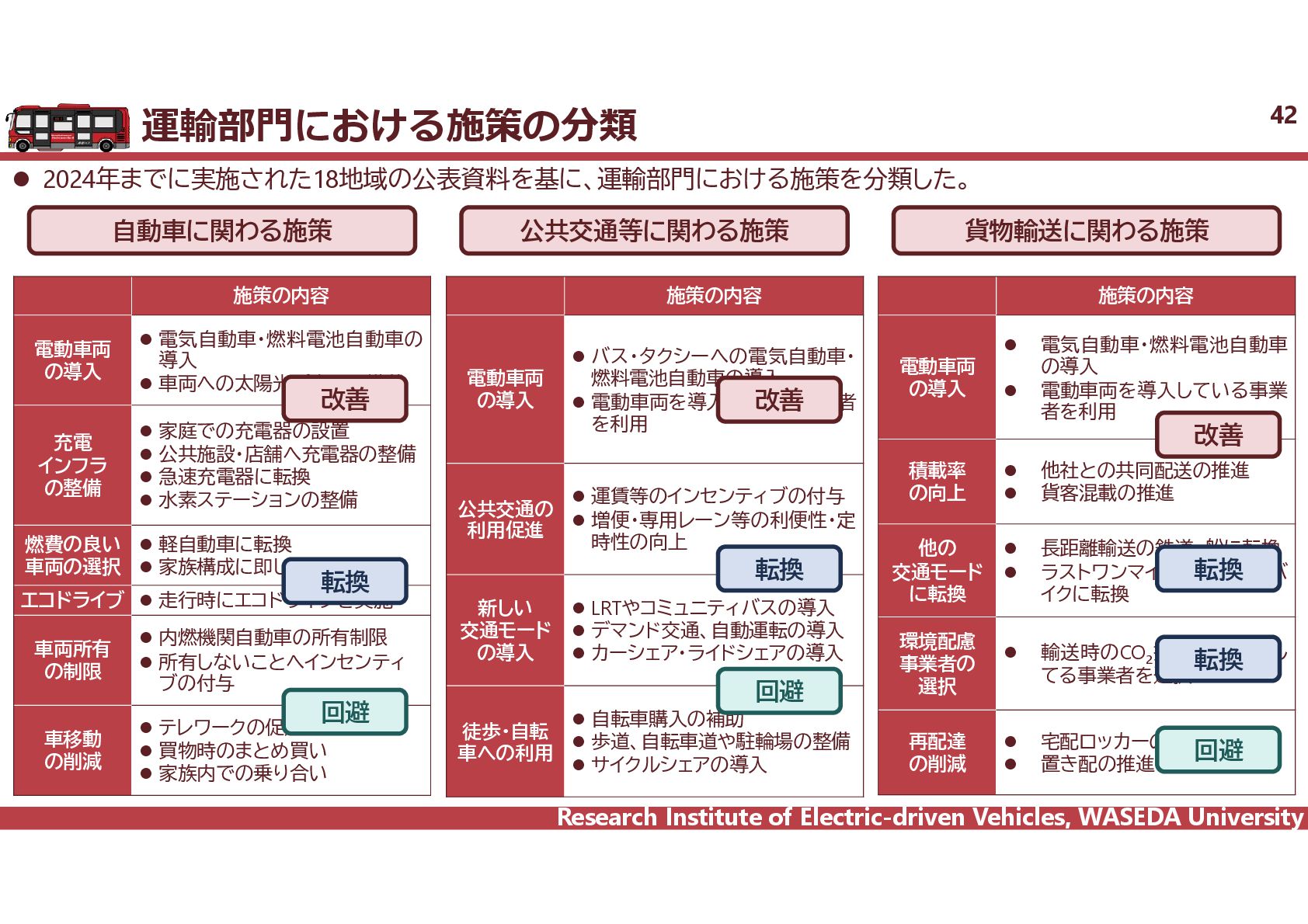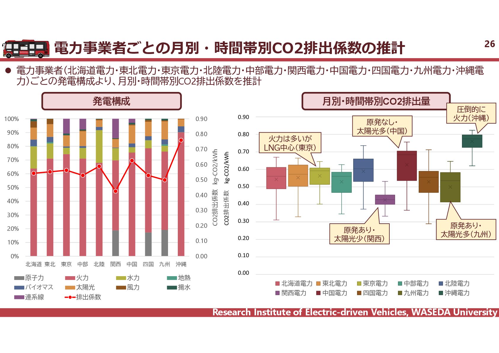 R² = 0.8942 0 20 40 60 80 100 120 140 160 0 2,000 4,000 6,000 8,000 10,000 12,000 14,000 16,000 18,000 電費 km/kWh ⾞両総重量 kg ⾞両総重量と電費の相関 35 電気バス(38車種50路線)、グリーンスローモビリティ(6車種21路線)、超小型モビリティ(8車種11地区)、電動キックボード(6車種 12地区)の電費に加えて、乗用車EV148車種のWTLCモードでの電費を調査し、電費と車両総重量の相関を把握した。 電気バス38車種50路線 電動キックボード 6車種12地区 超小型EV 8車種11地区 GSM 6車種21路線 乗用車148車種 y = 1284.4x-0.746 R² = 0.6738 0 0.5 1 1.5 2 2.5 3 2,000 6,000 10,000 14,000 18,000 電費 km/kWh ⾞両総重量 kg y = 4544.5x-0.859 R² = 0.7163 2 4 6 8 10 12 14 500 1,000 1,500 2,000 2,500 3,000 3,500 電費 km/kWh ⾞両総重量 kg 小型 中型 大型