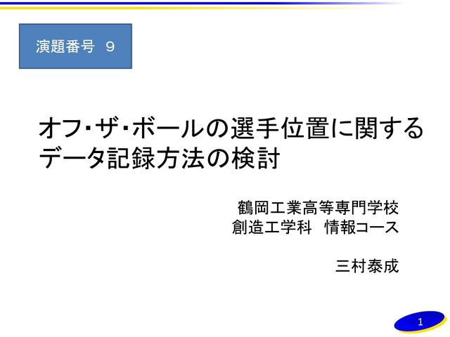 オフ・ザ・ボールの選手位置に関する データ記録方法の検討 鶴岡工業高等専門学校 創造工学科 情報コース 三村泰成 演題番号 9 1