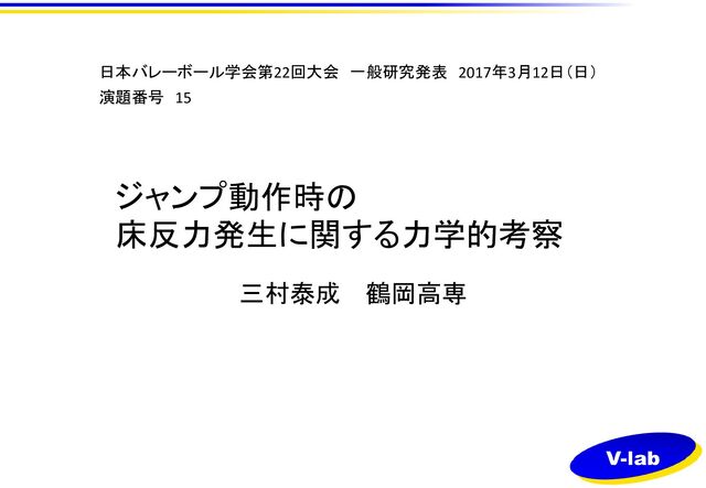 ジャンプ動作時の 床反力発生に関する力学的考察 三村泰成 鶴岡高専 日本バレーボール学会第22回大会 一般研究発表 2017年3月12日(日) 演題番号 15
