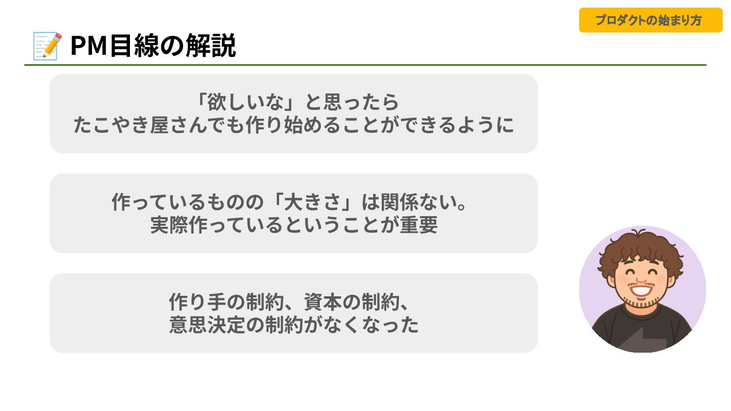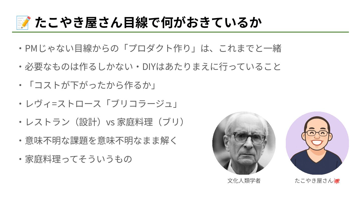 大阪・高槻でたこやき屋を営む現役教師の川人と、東京・江東区で駄菓子屋を営む現役PMの永嶋。異分野の2人が出会い、「子ども向け家庭教師AI」という未来の教育プロダクトを作り始めました。私たちにはそれぞれの店舗という日常の拠点があり、子どもたちが集うコミュニティがすでに存在します。そのため、アイデアを聞きながら形にし、その日のうちに試し、すぐに改善するという高速サイクルが可能です。AI時代になり、誰でも作れる時代が来ましたが、"作り方"そのものをアップデートし、ユーザーと共に未来を形づくる挑戦は、まだ始まったばかり。このプロダクトの開発過程を通じて、教育の未来をどう残し、どう変えていけるのか。そしてそれがプロダクトマネジメントの新しい姿になるのかを、現場の物語としてお届けします。