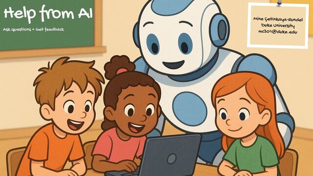 an image with a robot helping children. The kids should be looking at a laptop. And make the image rectangle, with height less than width.” https://chatgpt.com/share/682c8623-b100-8000-972c-e7384801436f bit.ly/help-from-ai-icerm Mine Çetinkaya-Rundel Duke University [email protected]