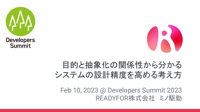 2023/02/10、デブサミ2023の登壇資料です。 『目的と抽象化の関係性から分かる、システムの設計精度を高める考え方』 https://event.shoeisha.jp/devsumi/20230209/session/4182/