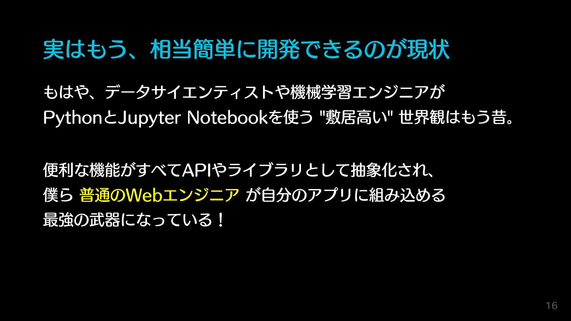 実はもう、相当簡単に開発できるのが現状 もはや、データサイエンティストや機械学習エンジニアが PythonとJupyter Notebookを使う "敷居高い" 世界観はもう昔。 便利な機能がすべてAPIやライブラリとして抽象化され、 僕ら 普通のWebエンジニア が自分のアプリに組み込める