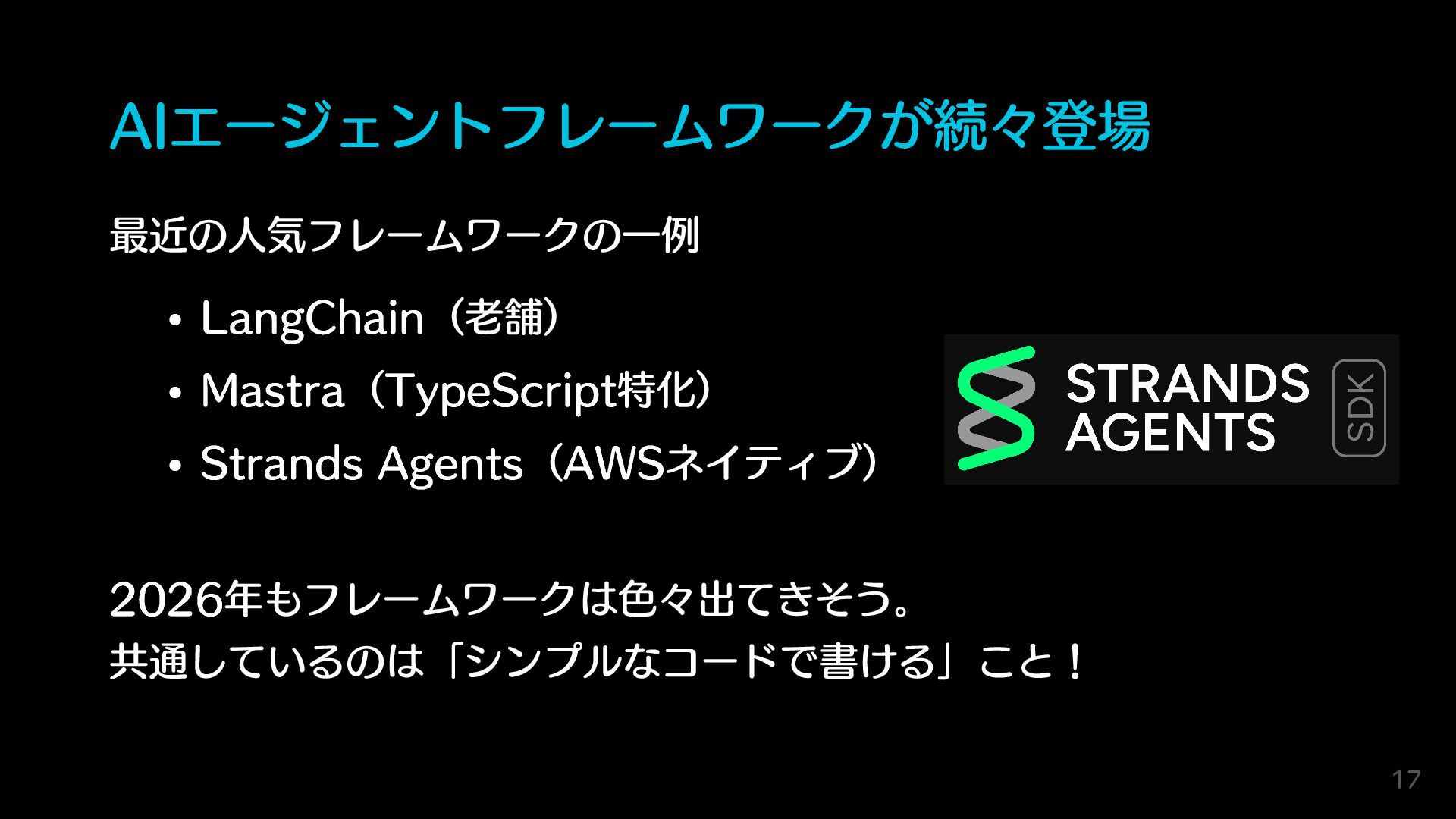 AIエージェントフレームワークが続々登場 最近の人気フレームワークの一例 LangChain(老舗) Mastra(TypeScript特化) Strands Agents(AWSネイティブ) 2026年もフレームワークは色々出てきそう。 共通しているのは「シンプルなコードで書ける」こと! 17