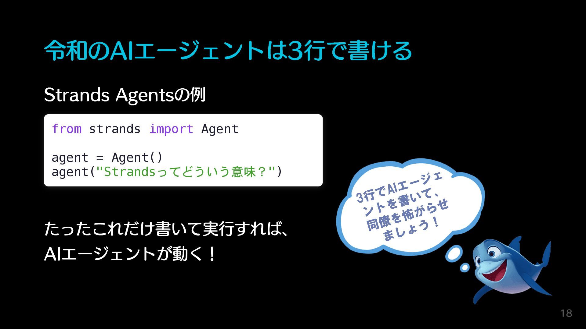agent("Strandsってどういう意味?") たったこれだけ書いて実行すれば、 AIエージェントが動く! 18