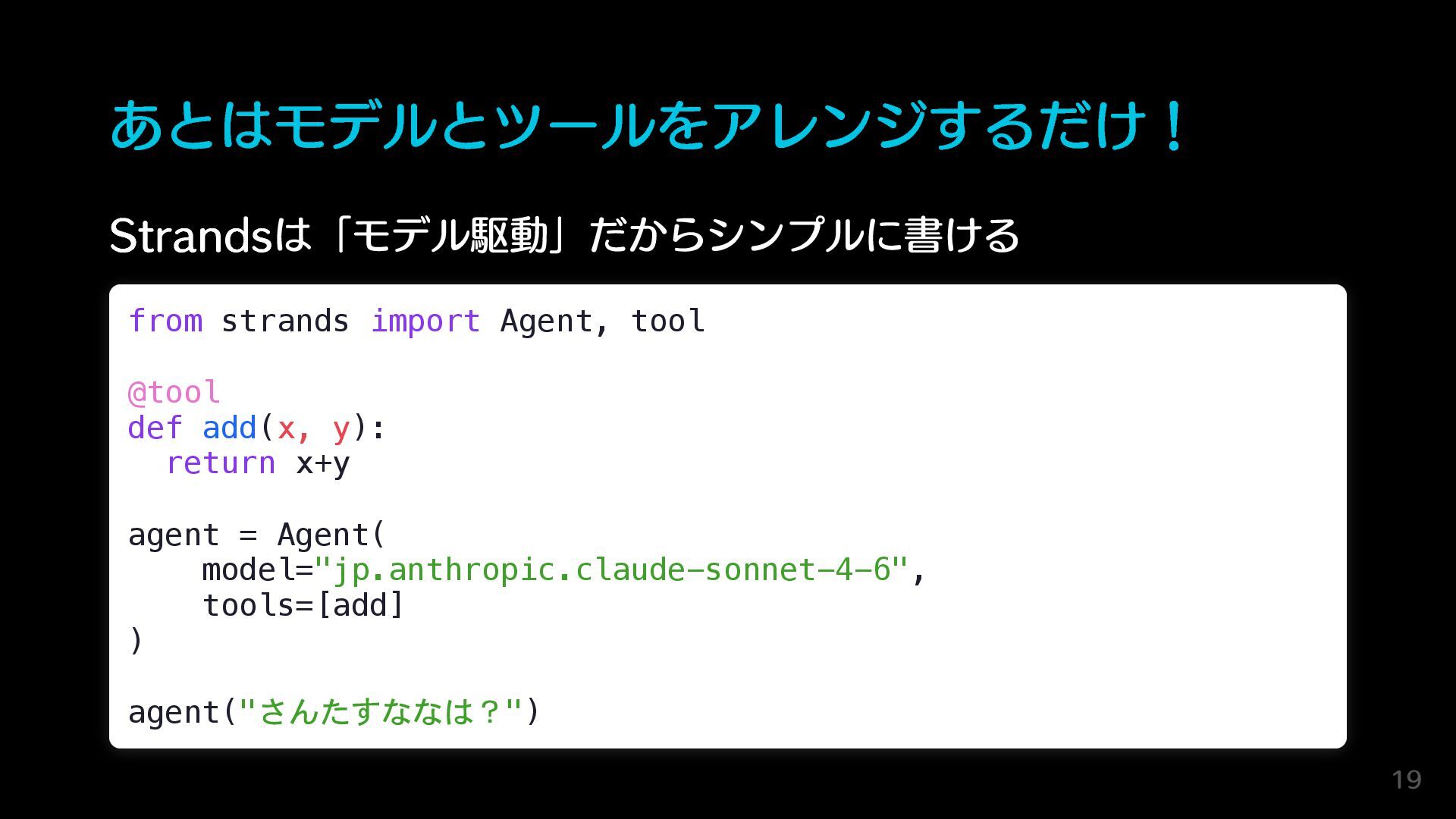 あとはモデルとツールをアレンジするだけ! Strandsは「モデル駆動」だからシンプルに書ける from strands import Agent, tool @tool def add(x,