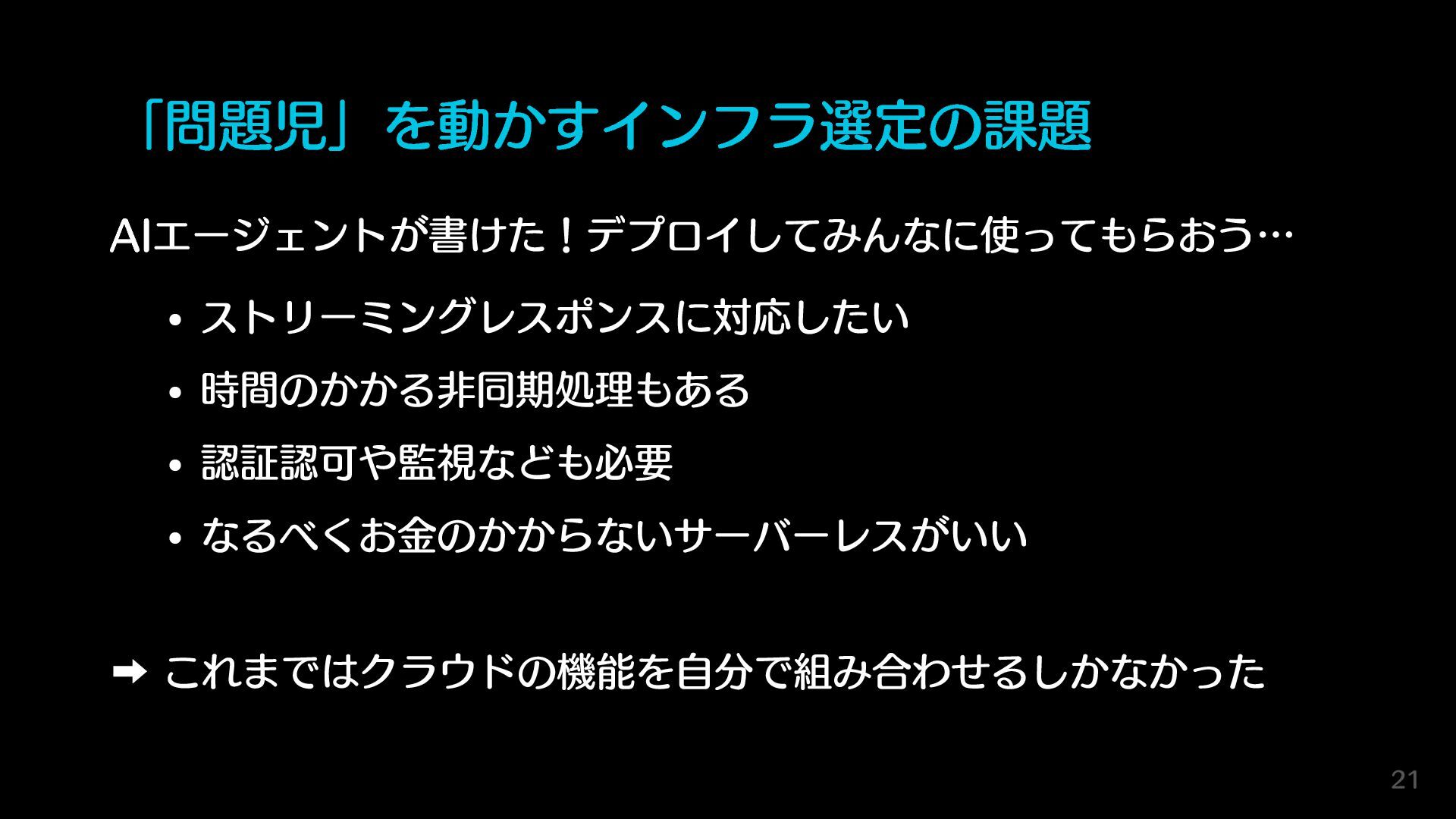 「問題児」を動かすインフラ選定の課題 AIエージェントが書けた!デプロイしてみんなに使ってもらおう… ストリーミングレスポンスに対応したい 時間のかかる非同期処理もある 認証認可や監視なども必要 なるべくお金のかからないサーバーレスがいい ➡︎ これまではクラウドの機能を自分で組み合わせるしかなかった 21