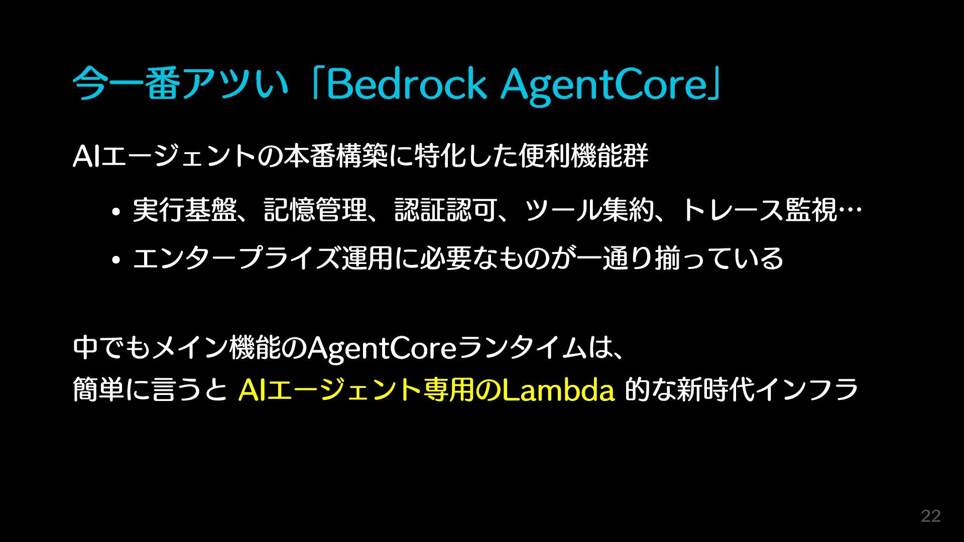今一番アツい「Bedrock AgentCore」 AIエージェントの本番構築に特化した便利機能群 実行基盤、記憶管理、認証認可、ツール集約、トレース監視… エンタープライズ運用に必要なものが一通り揃っている 中でもメイン機能のAgentCoreランタイムは、 簡単に言うと AIエージェント専用のLambda 的な新時代インフラ 22