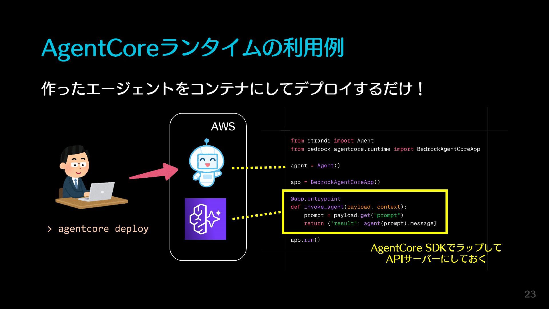 AgentCoreランタイムの利用例 作ったエージェントをコンテナにしてデプロイするだけ! 23