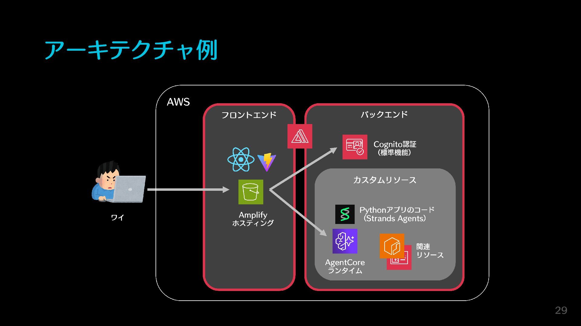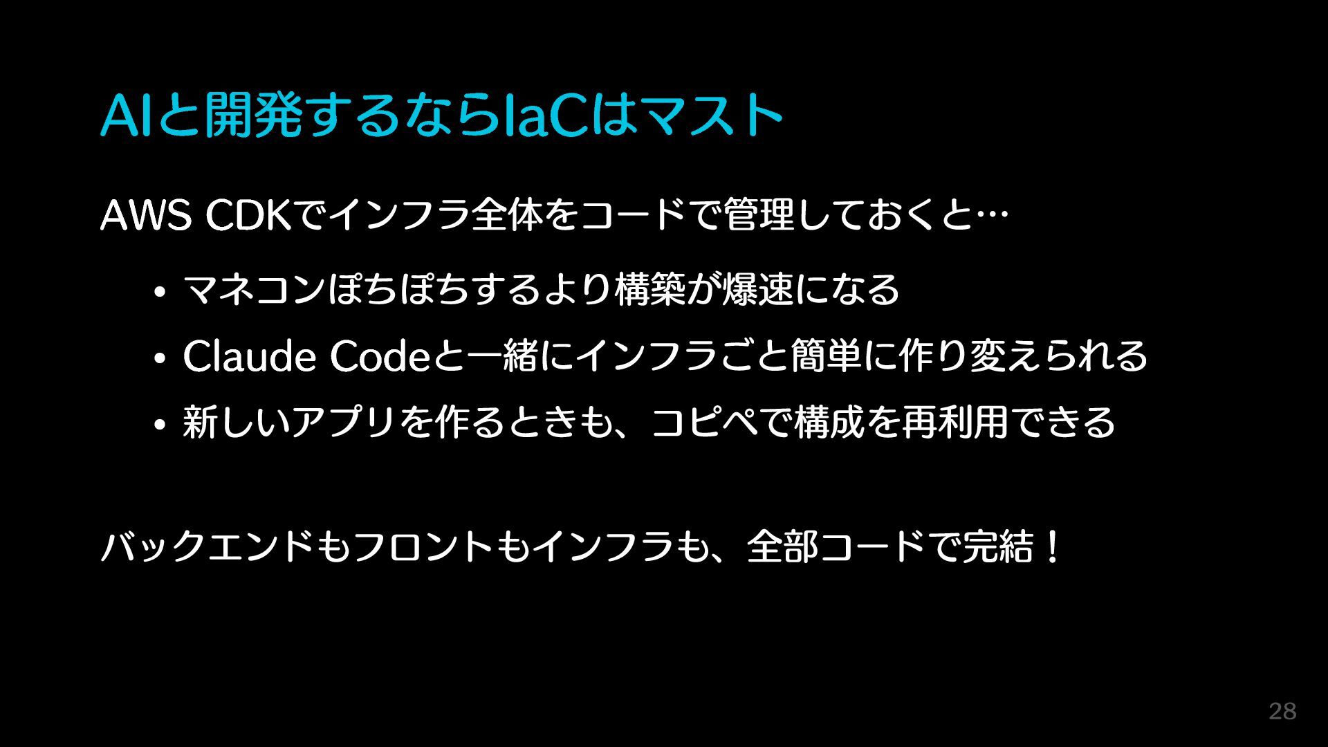 AIと開発するならIaCはマスト AWS CDKでインフラ全体をコードで管理しておくと… マネコンぽちぽちするより構築が爆速になる Claude Codeと一緒にインフラごと簡単に作り変えられる 新しいアプリを作るときも、コピペで構成を再利用できる バックエンドもフロントもインフラも、全部コードで完結! 28