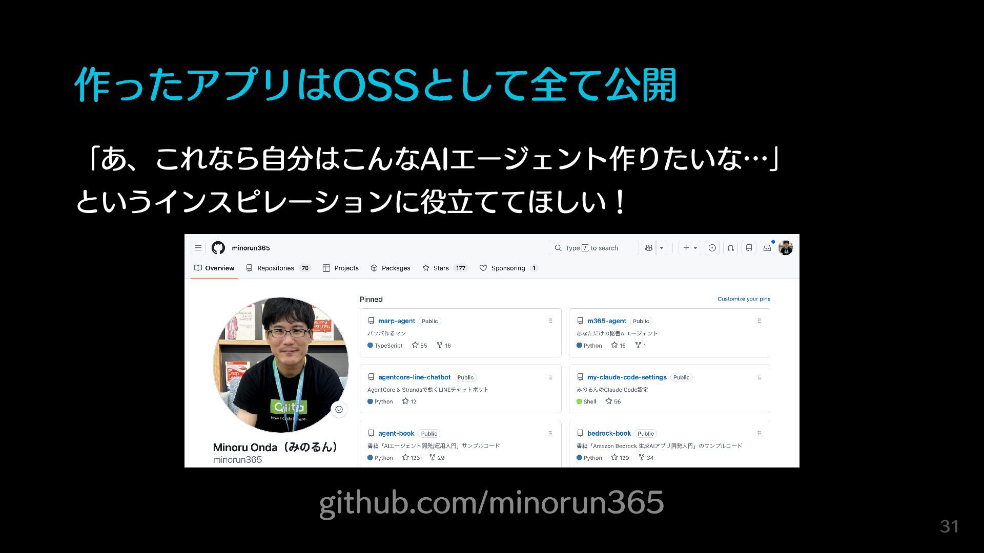 作ったアプリはOSSとして全て公開 「あ、これなら自分はこんなAIエージェント作りたいな…」 というインスピレーションに役立ててほしい! github.com/minorun365 31