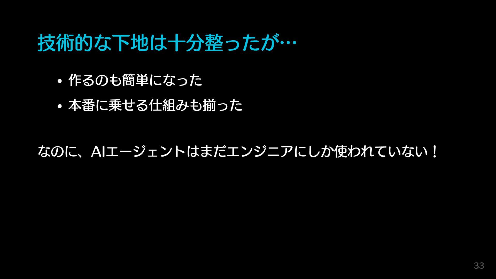 技術的な下地は十分整ったが… 作るのも簡単になった 本番に乗せる仕組みも揃った なのに、AIエージェントはまだエンジニアにしか使われていない! 33