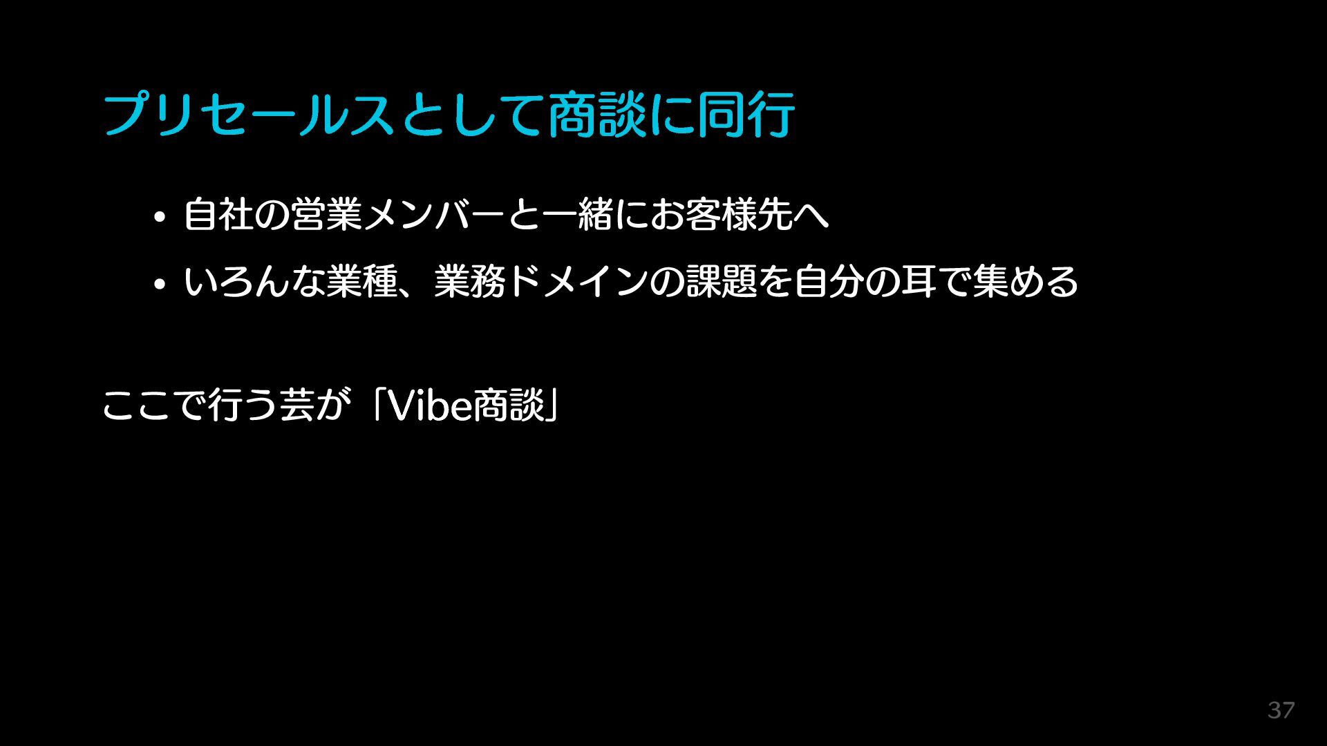 プリセールスとして商談に同行 自社の営業メンバーと一緒にお客様先へ いろんな業種、業務ドメインの課題を自分の耳で集める ここで行う芸が「Vibe商談」 37