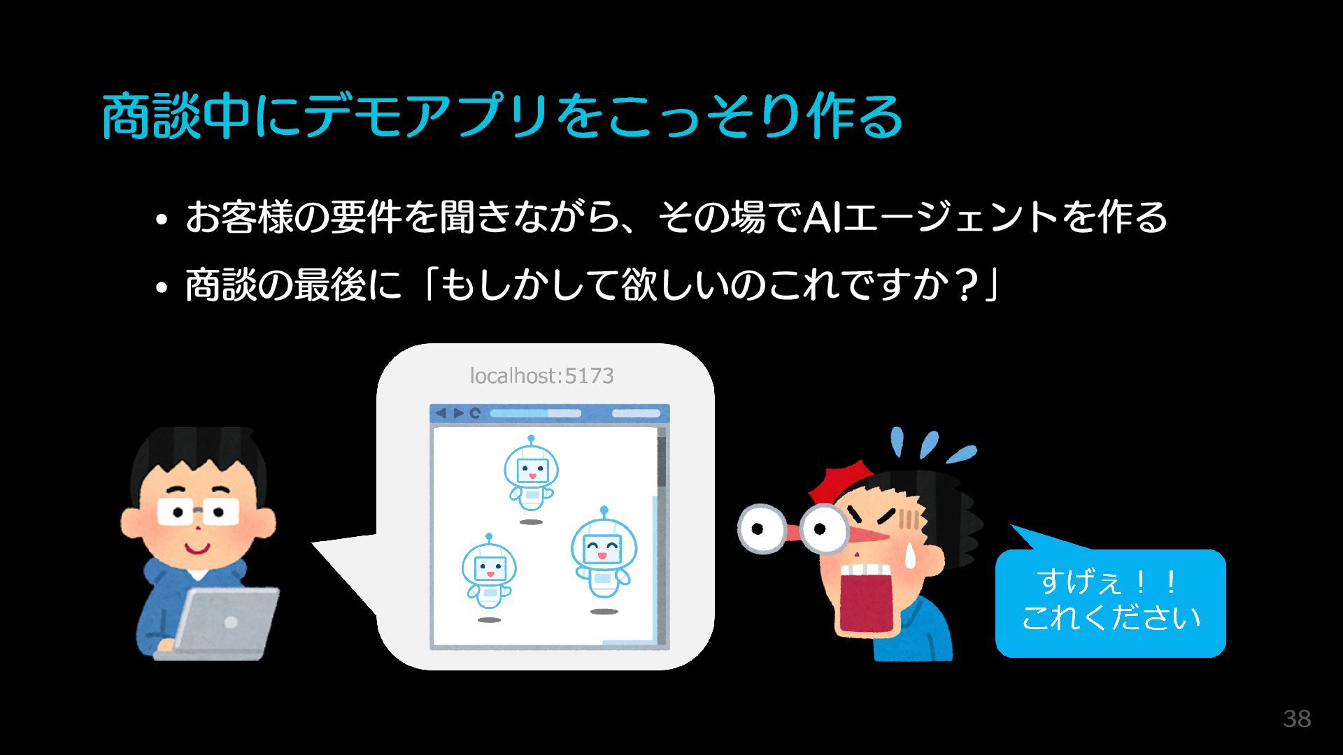 商談中にデモアプリをこっそり作る お客様の要件を聞きながら、その場でAIエージェントを作る 商談の最後に「もしかして欲しいのこれですか?」 38