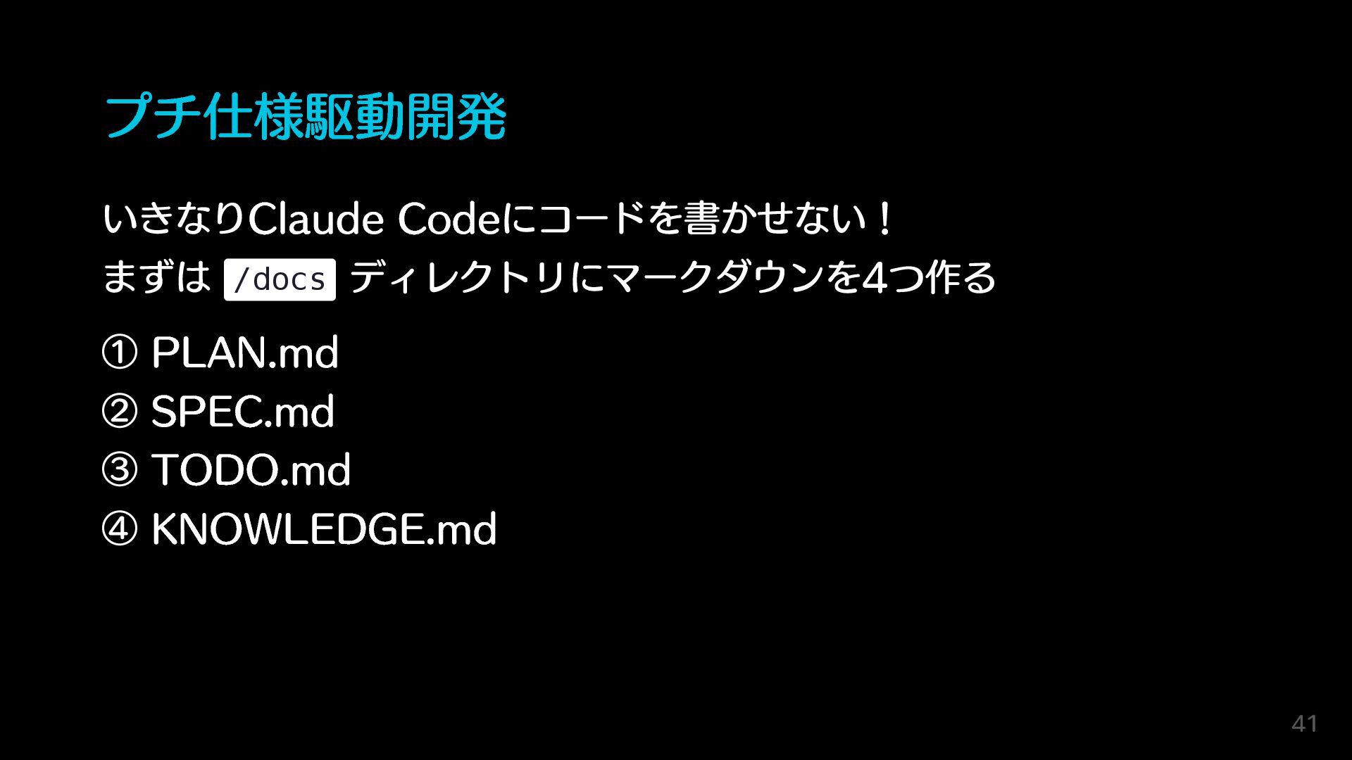 プチ仕様駆動開発 いきなりClaude Codeにコードを書かせない! まずは /docs ディレクトリにマークダウンを4つ作る ① PLAN.md ② SPEC.md