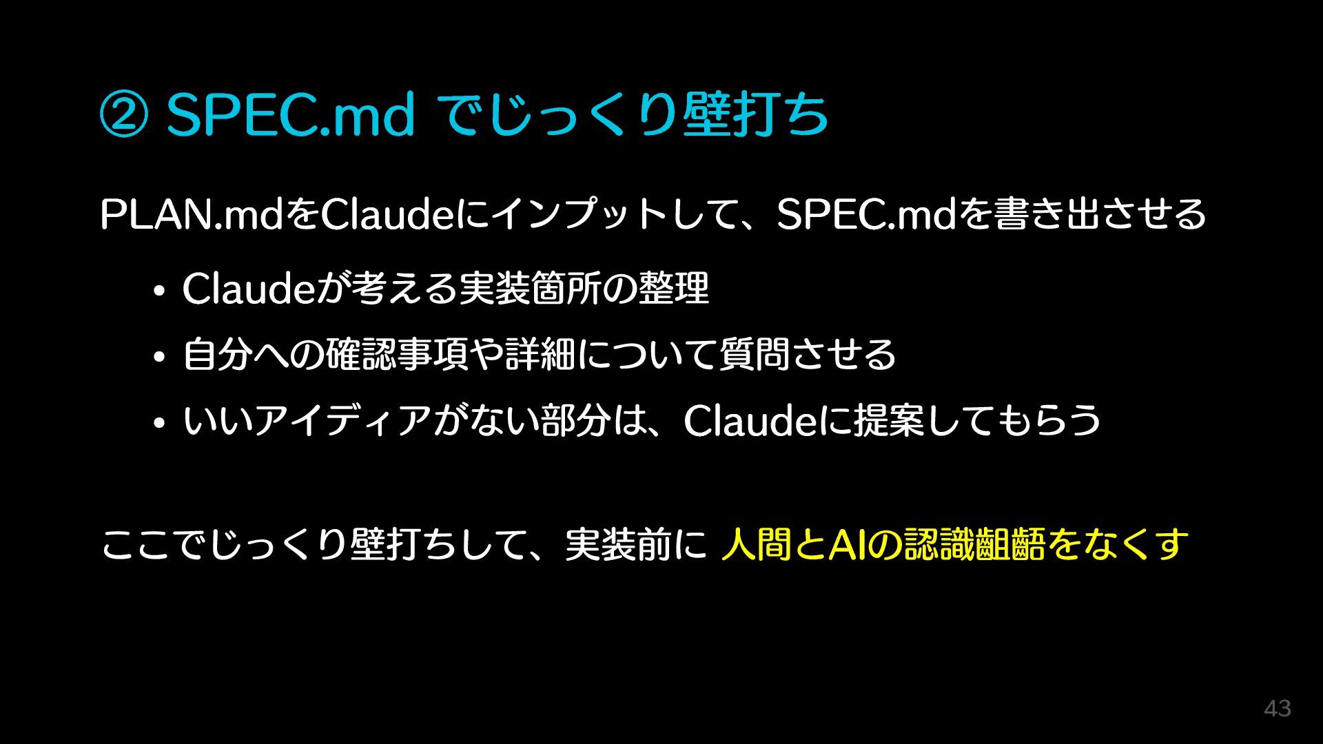 ② SPEC.md でじっくり壁打ち PLAN.mdをClaudeにインプットして、SPEC.mdを書き出させる Claudeが考える実装箇所の整理 自分への確認事項や詳細について質問させる いいアイディアがない部分は、Claudeに提案してもらう ここでじっくり壁打ちして、実装前に 人間とAIの認識齟齬をなくす 43