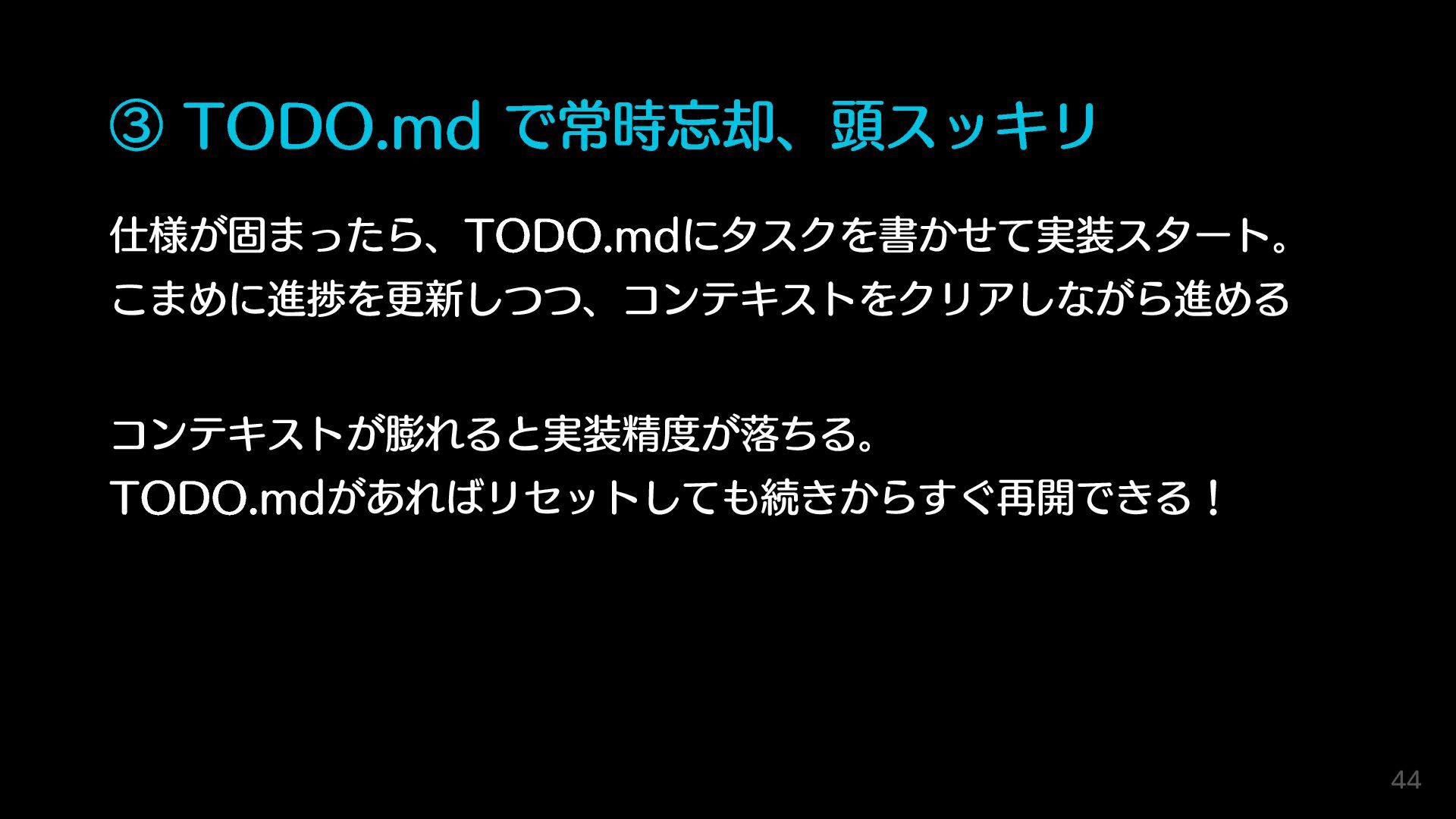 ③ TODO.md で常時忘却、頭スッキリ 仕様が固まったら、TODO.mdにタスクを書かせて実装スタート。 こまめに進捗を更新しつつ、コンテキストをクリアしながら進める コンテキストが膨れると実装精度が落ちる。 TODO.mdがあればリセットしても続きからすぐ再開できる! 44