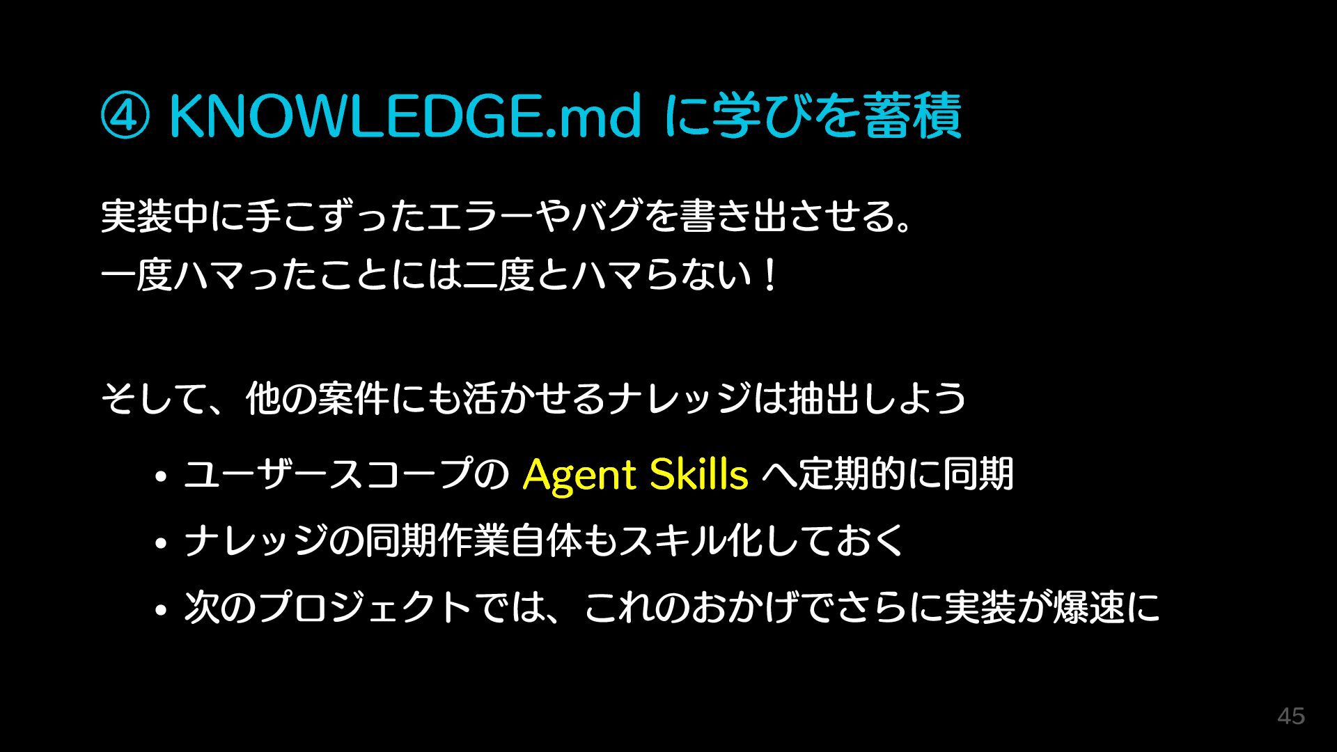 ④ KNOWLEDGE.md に学びを蓄積 実装中に手こずったエラーやバグを書き出させる。 一度ハマったことには二度とハマらない! そして、他の案件にも活かせるナレッジは抽出しよう ユーザースコープの Agent Skills へ定期的に同期
