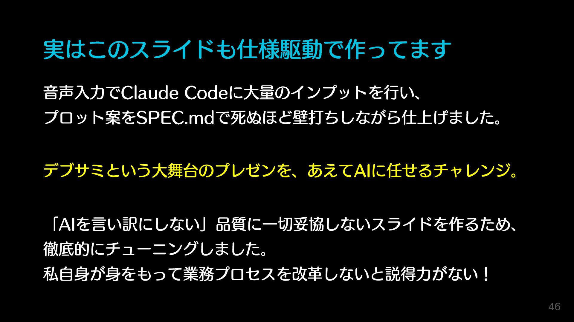 実はこのスライドも仕様駆動で作ってます 音声入力でClaude Codeに大量のインプットを行い、 プロット案をSPEC.mdで死ぬほど壁打ちしながら仕上げました。 デブサミという大舞台のプレゼンを、あえてAIに任せるチャレンジ。 「AIを言い訳にしない」品質に一切妥協しないスライドを作るため、 徹底的にチューニングしました。 私自身が身をもって業務プロセスを改革しないと説得力がない! 46
