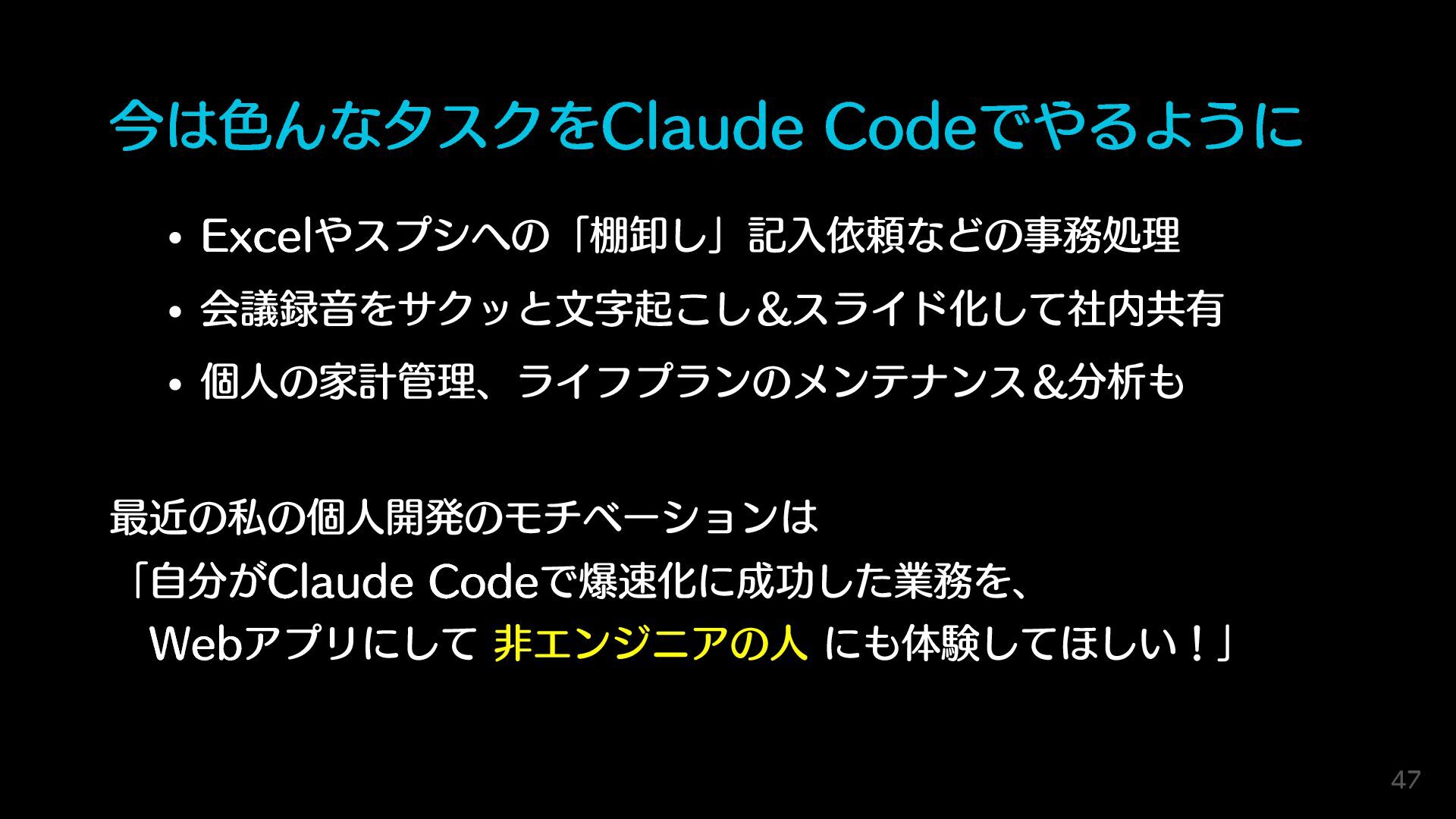 今は色んなタスクをClaude Codeでやるように Excelやスプシへの「棚卸し」記入依頼などの事務処理 会議録音をサクッと文字起こし&スライド化して社内共有 個人の家計管理、ライフプランのメンテナンス&分析も 最近の私の個人開発のモチベーションは 「自分がClaude Codeで爆速化に成功した業務を、 Webアプリにして 非エンジニアの人