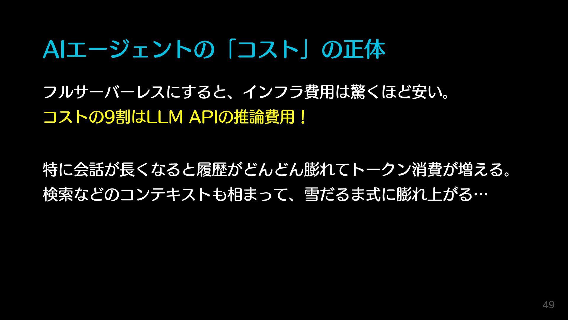 AIエージェントの「コスト」の正体 フルサーバーレスにすると、インフラ費用は驚くほど安い。 コストの9割はLLM APIの推論費用! 特に会話が長くなると履歴がどんどん膨れてトークン消費が増える。 検索などのコンテキストも相まって、雪だるま式に膨れ上がる… 49