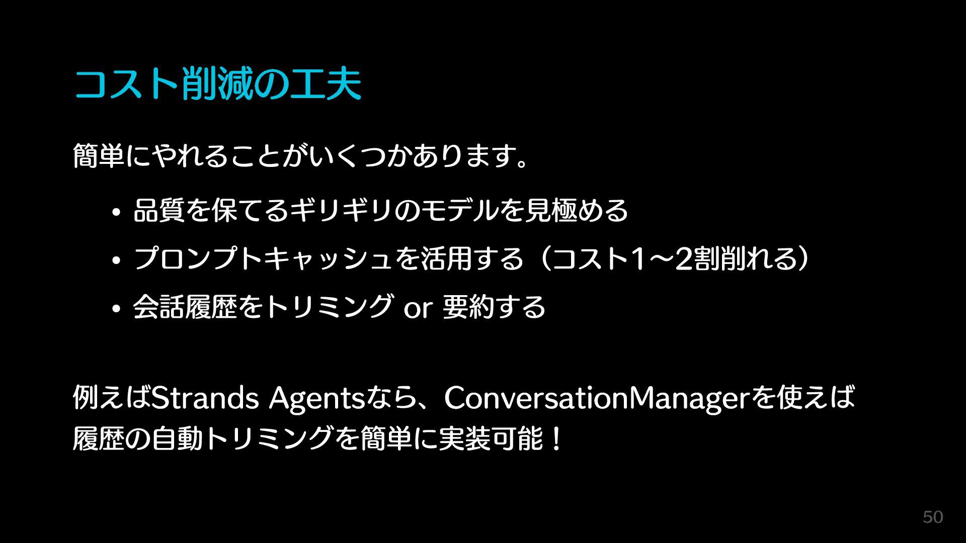 コスト削減の工夫 簡単にやれることがいくつかあります。 品質を保てるギリギリのモデルを見極める プロンプトキャッシュを活用する(コスト1〜2割削れる) 会話履歴をトリミング or 要約する 例えばStrands Agentsなら、ConversationManagerを使えば 履歴の自動トリミングを簡単に実装可能!