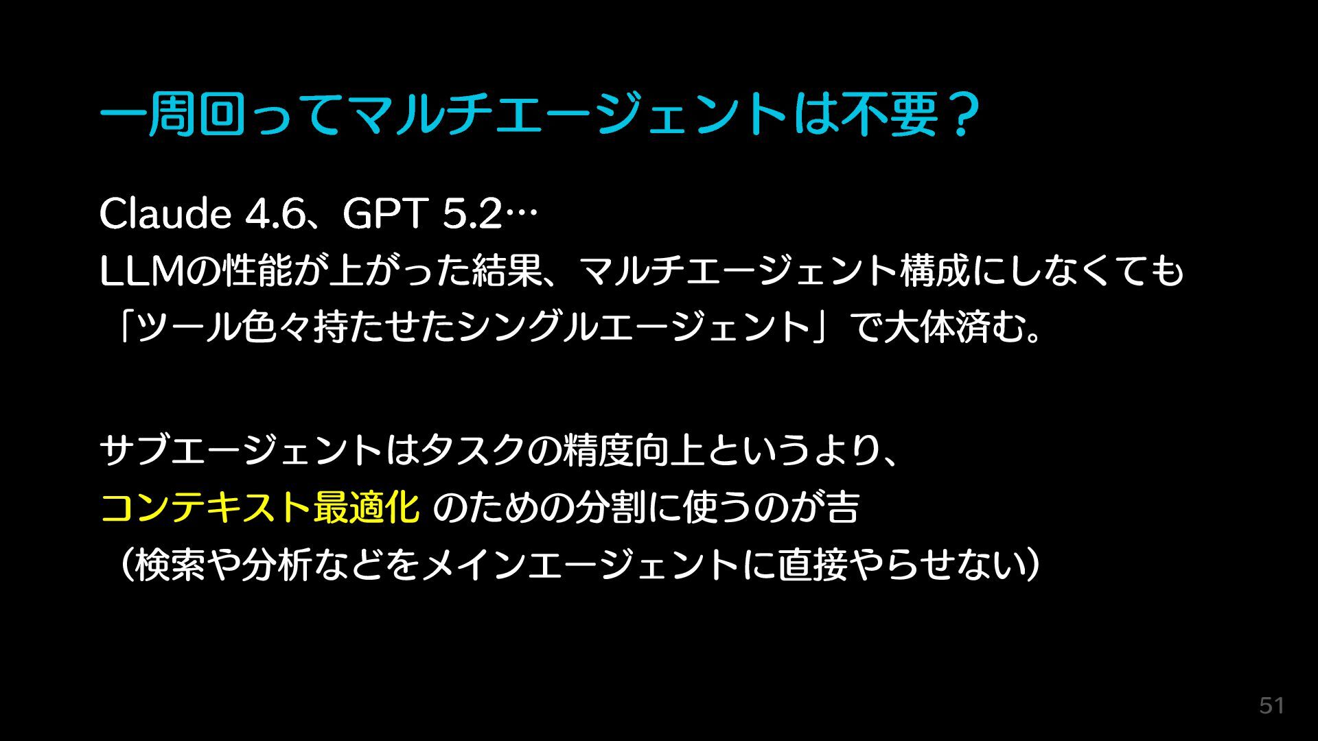 一周回ってマルチエージェントは不要? Claude 4.6、GPT 5.2… LLMの性能が上がった結果、マルチエージェント構成にしなくても 「ツール色々持たせたシングルエージェント」で大体済む。 サブエージェントはタスクの精度向上というより、 コンテキスト最適化 のための分割に使うのが吉 (検索や分析などをメインエージェントに直接やらせない)