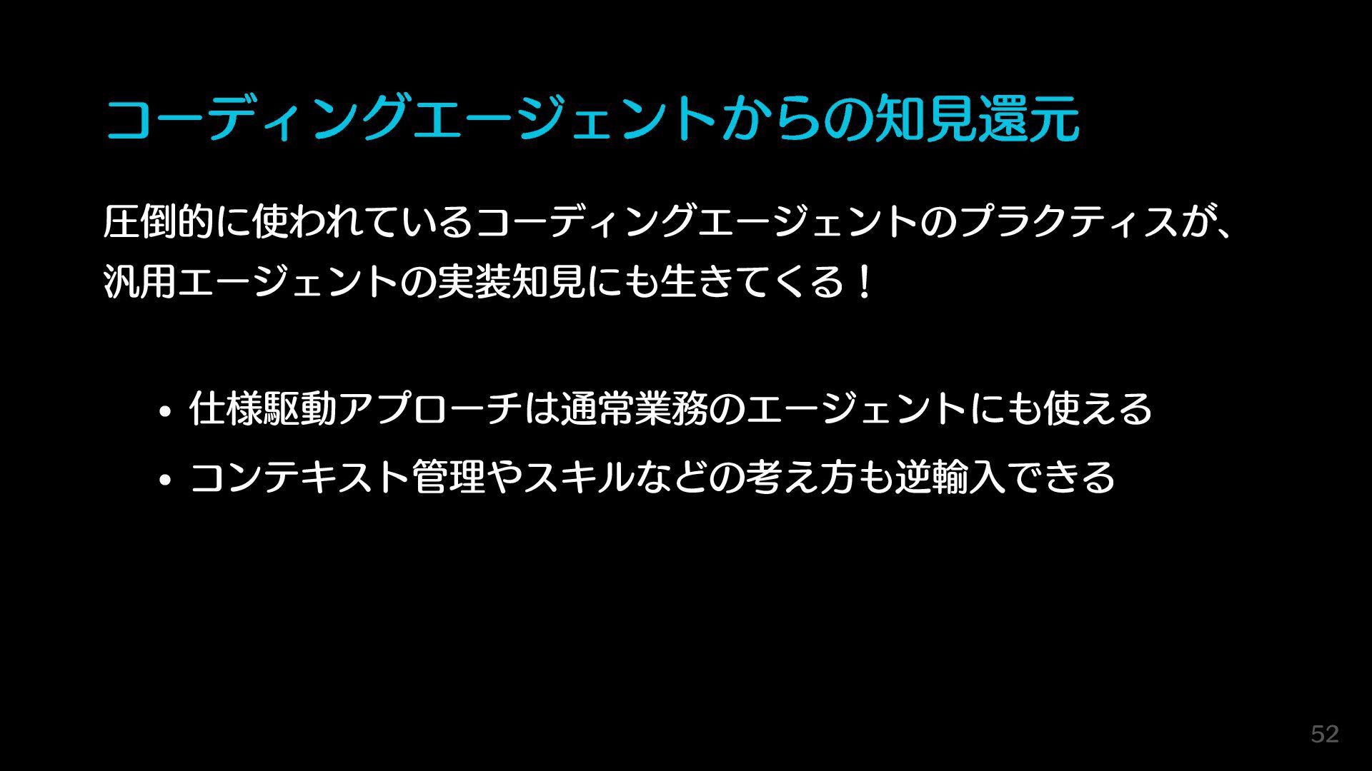 コーディングエージェントからの知見還元 圧倒的に使われているコーディングエージェントのプラクティスが、 汎用エージェントの実装知見にも生きてくる! 仕様駆動アプローチは通常業務のエージェントにも使える コンテキスト管理やスキルなどの考え方も逆輸入できる 52