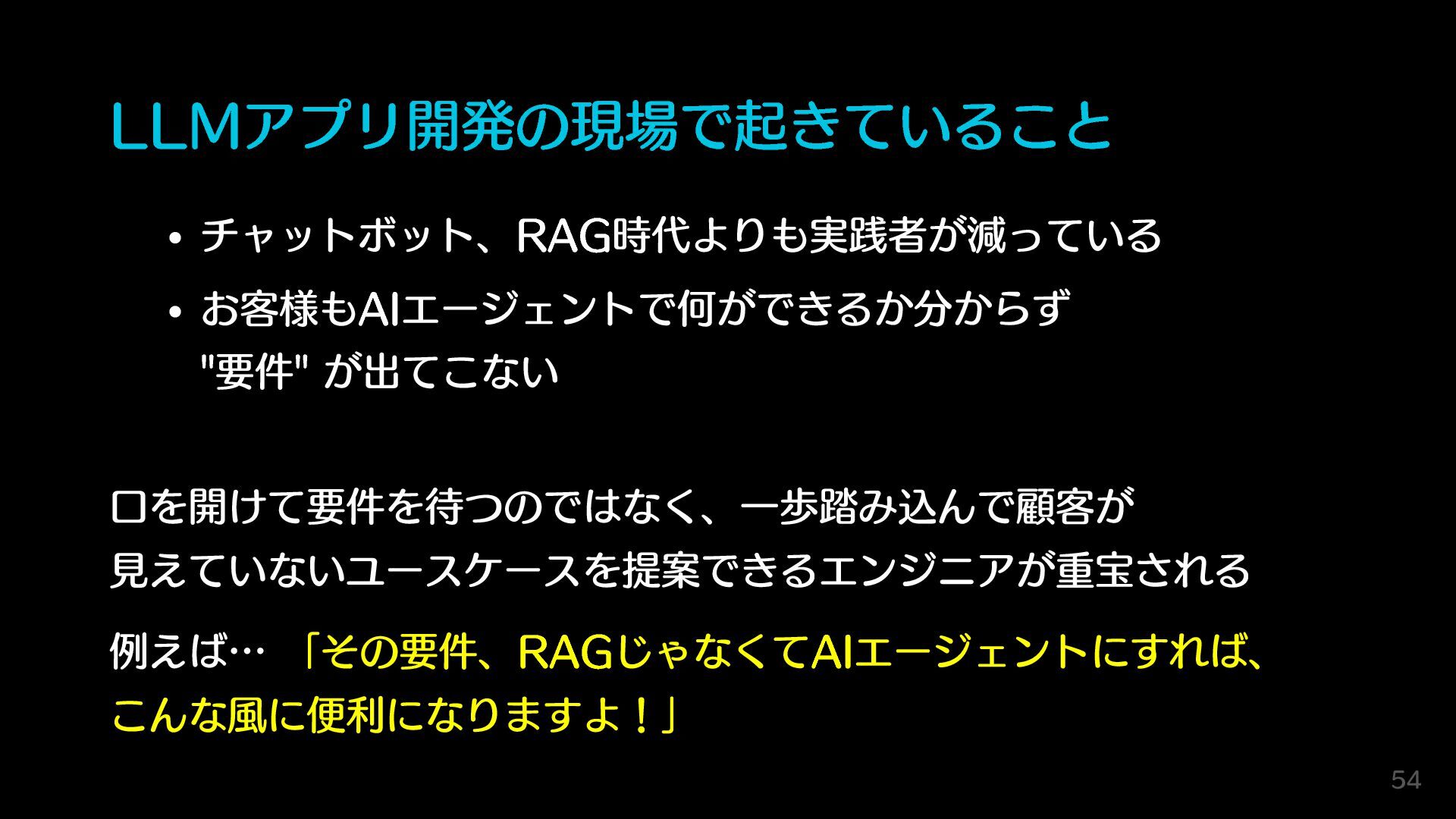 LLMアプリ開発の現場で起きていること チャットボット、RAG時代よりも実践者が減っている お客様もAIエージェントで何ができるか分からず "要件" が出てこない 口を開けて要件を待つのではなく、一歩踏み込んで顧客が 見えていないユースケースを提案できるエンジニアが重宝される 例えば… 「その要件、RAGじゃなくてAIエージェントにすれば、 こんな風に便利になりますよ!」