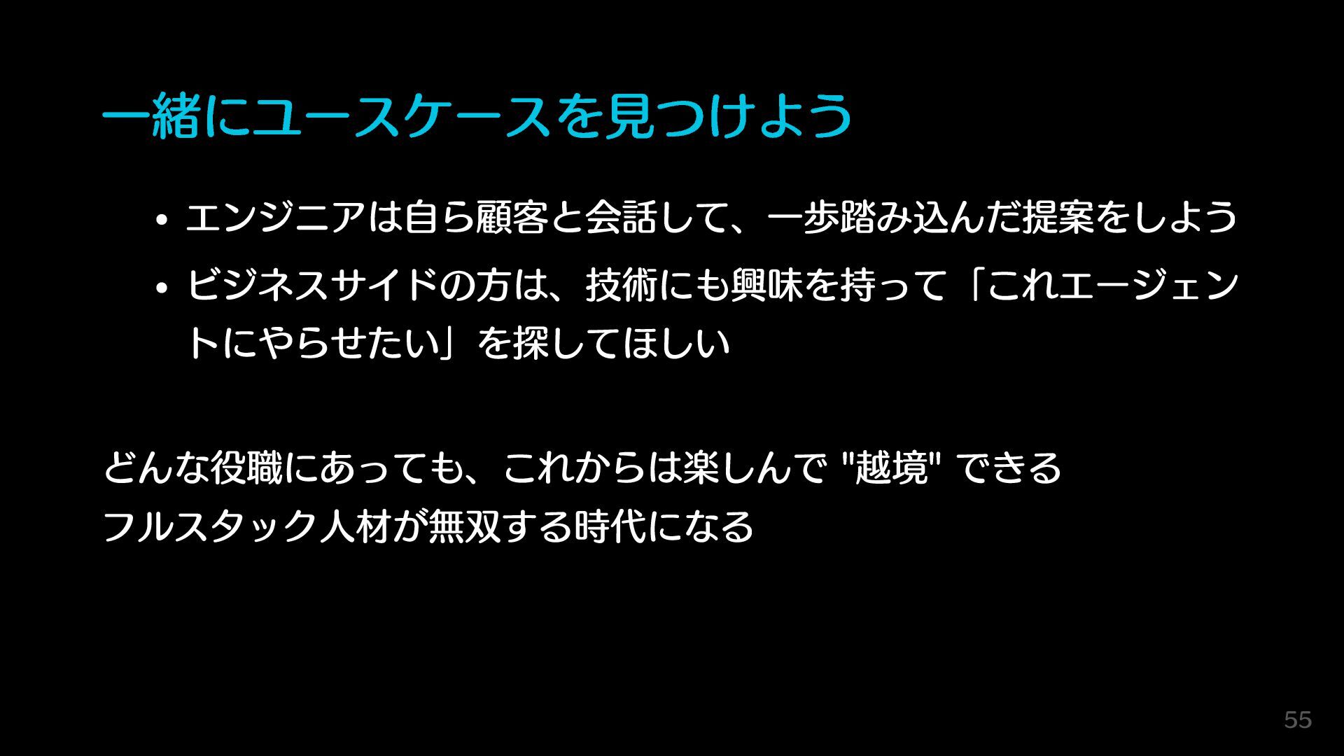 一緒にユースケースを見つけよう エンジニアは自ら顧客と会話して、一歩踏み込んだ提案をしよう ビジネスサイドの方は、技術にも興味を持って「これエージェン トにやらせたい」を探してほしい どんな役職にあっても、これからは楽しんで "越境" できる フルスタック人材が無双する時代になる 55