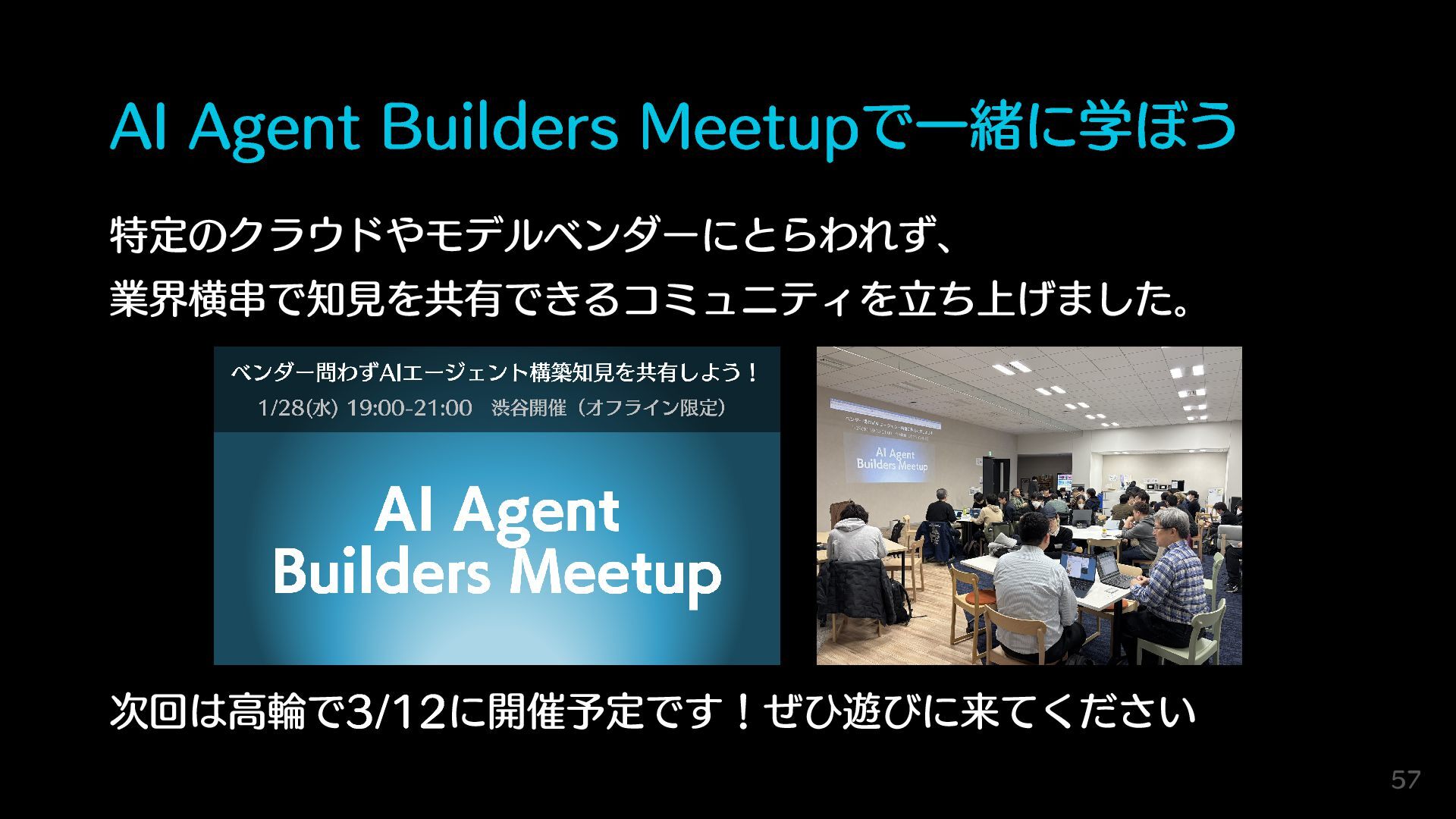 AI Agent Builders Meetupで一緒に学ぼう 特定のクラウドやモデルベンダーにとらわれず、 業界横串で知見を共有できるコミュニティを立ち上げました。 次回は高輪で3/12に開催予定です!ぜひ遊びに来てください 57