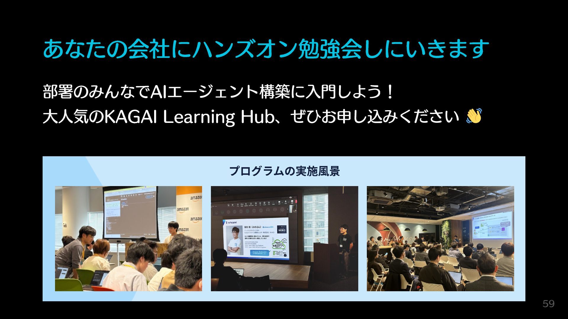 あなたの会社にハンズオン勉強会しにいきます 部署のみんなでAIエージェント構築に入門しよう! 大人気のKAGAI Learning Hub、ぜひお申し込みください 59