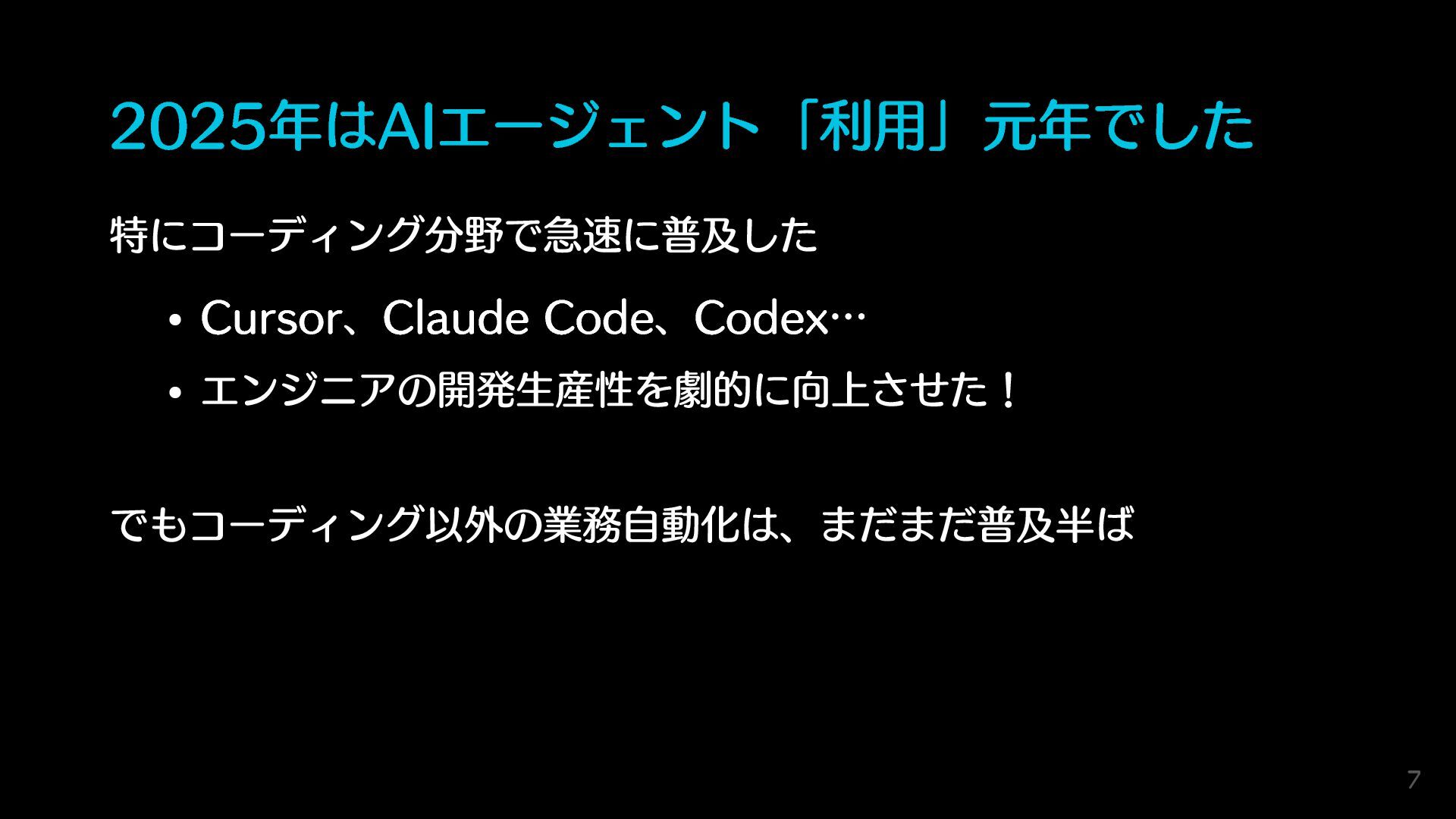 2025年はAIエージェント「利用」元年でした 特にコーディング分野で急速に普及した Cursor、Claude Code、Codex… エンジニアの開発生産性を劇的に向上させた! でもコーディング以外の業務自動化は、まだまだ普及半ば 7