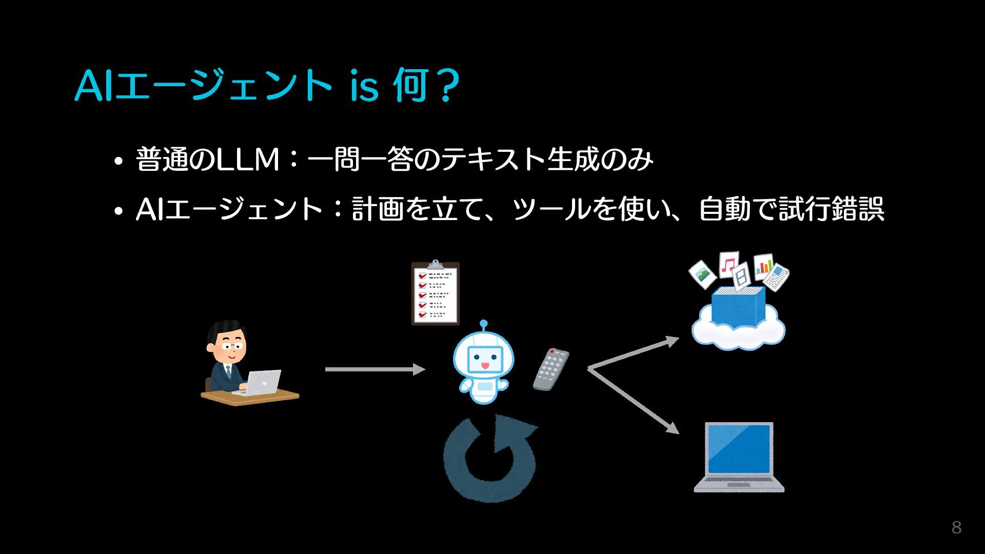 AIエージェント is 何? 普通のLLM:一問一答のテキスト生成のみ AIエージェント:計画を立て、ツールを使い、自動で試行錯誤 8