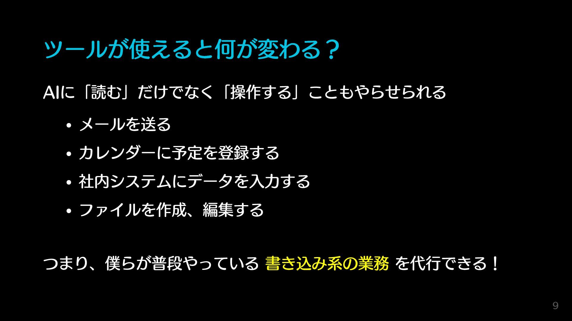ツールが使えると何が変わる? AIに「読む」だけでなく「操作する」こともやらせられる メールを送る カレンダーに予定を登録する 社内システムにデータを入力する ファイルを作成、編集する つまり、僕らが普段やっている 書き込み系の業務 を代行できる! 9