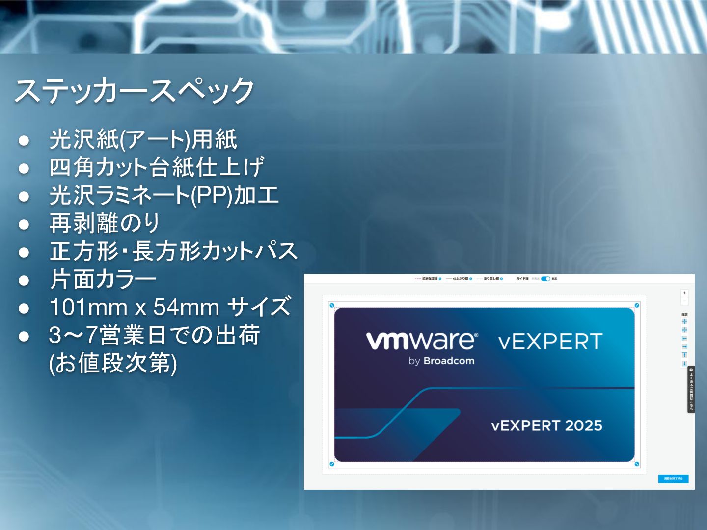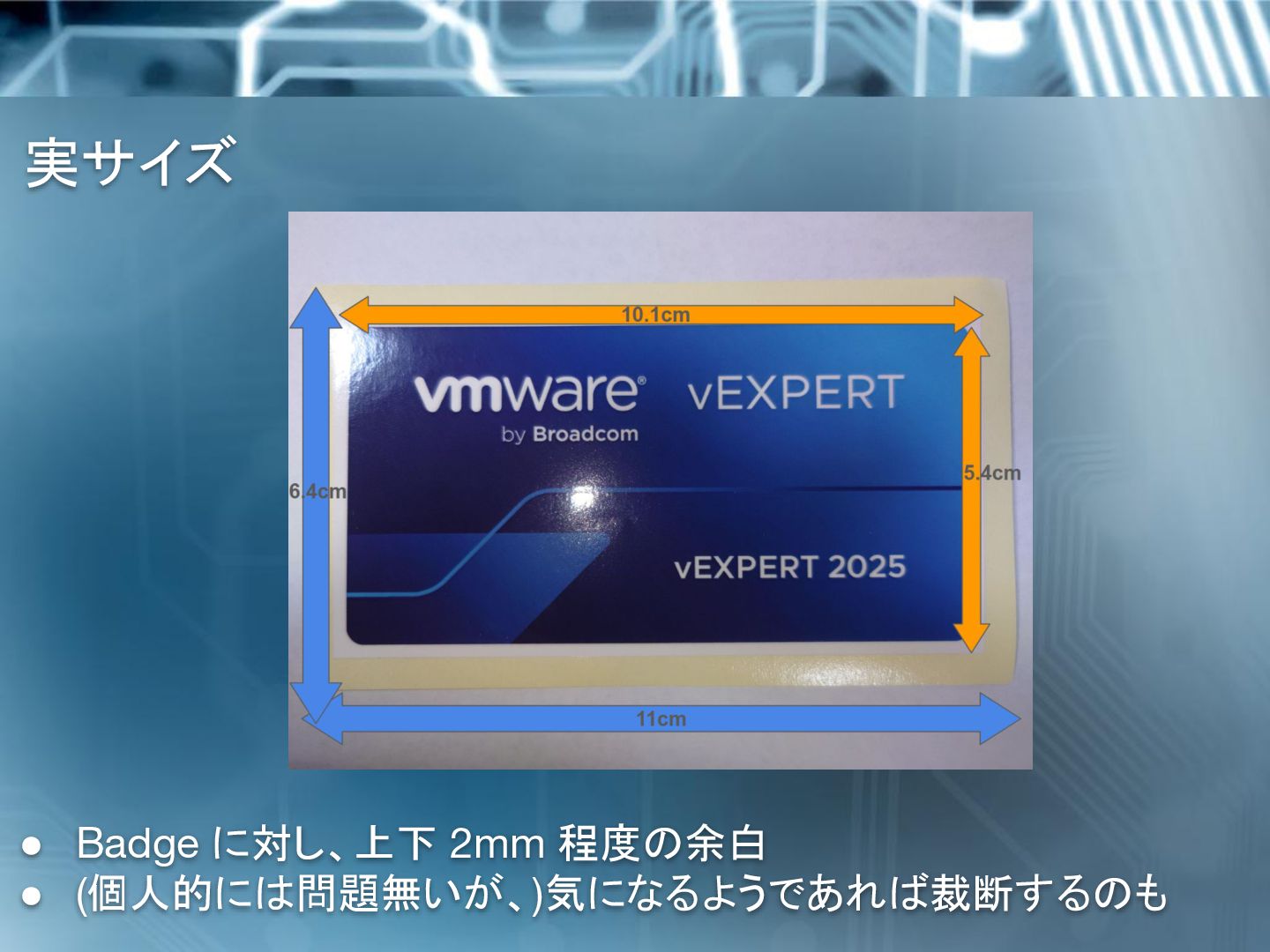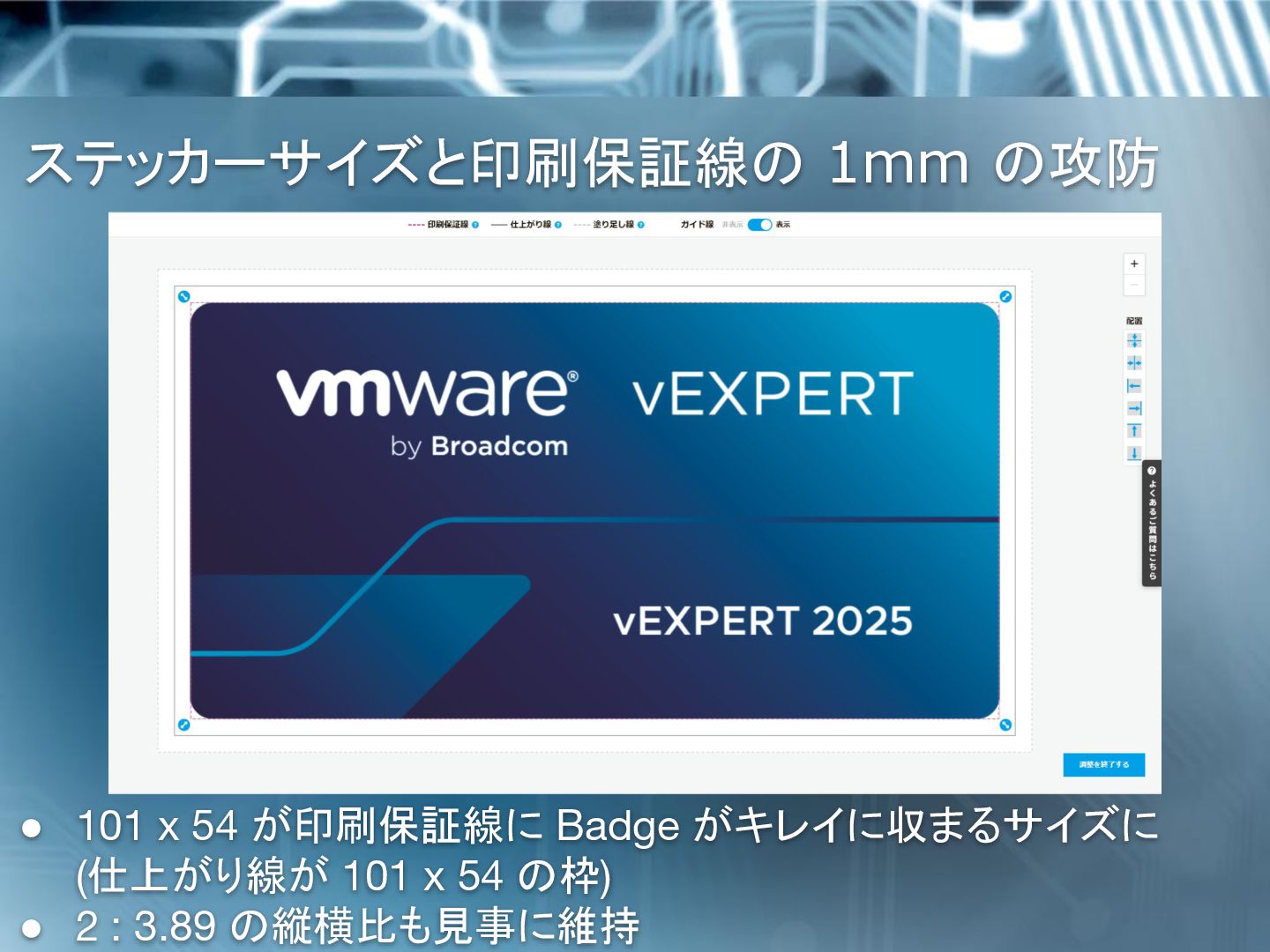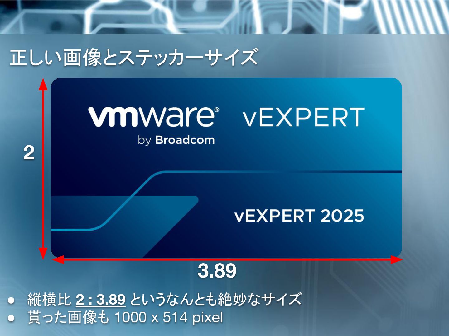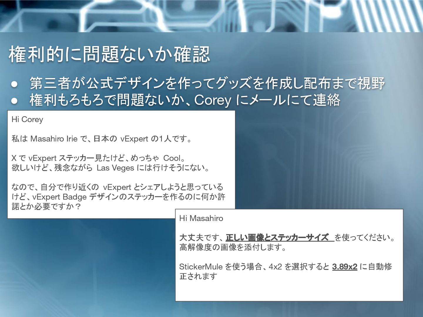 Irie で、日本の vExpert の1人です。 X で vExpert ステッカー見たけど、めっちゃ Cool。 欲しいけど、残念ながら Las Veges には行けそうにない。 なので、自分で作り近くの vExpert とシェアしようと思っている けど、vExpert Badge デザインのステッカーを作るのに何か許 諾とか必要ですか? Hi Masahiro 大丈夫です、正しい画像とステッカーサイズ を使ってください。 高解像度の画像を添付します。 StickerMule を使う場合、4x2 を選択すると 3.89x2 に自動修 正されます