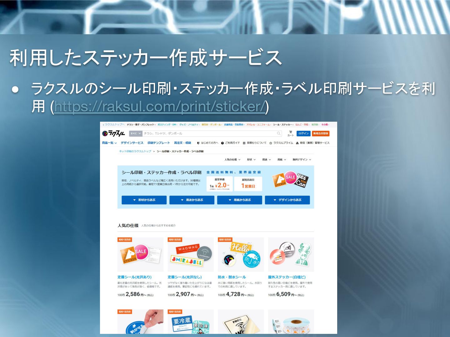 6. ステッカースペック • 光沢紙(アート)用紙 • 四角カット台紙仕上げ • 光沢ラミネート(PP)加工 • 再剥離のり •