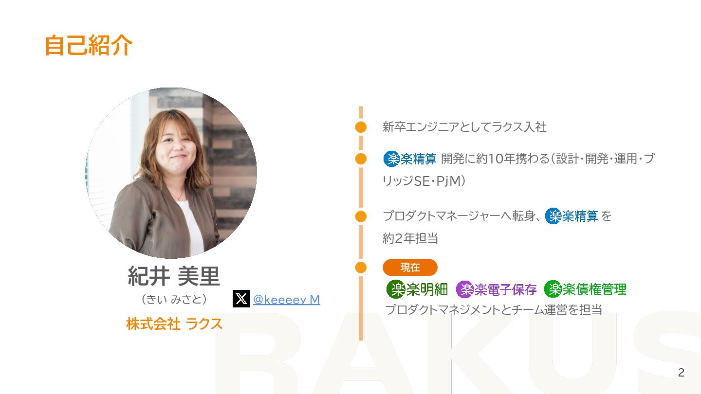 「楽楽精算」開発に約10年携わる(設計・開発・運用・ブ リッジSE・PjM) プロダクトマネージャーへ転身、「楽楽精算」を 約2年担当 現在 @keeeey_M 2
