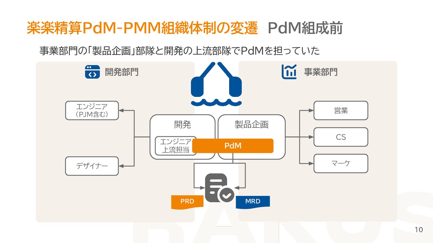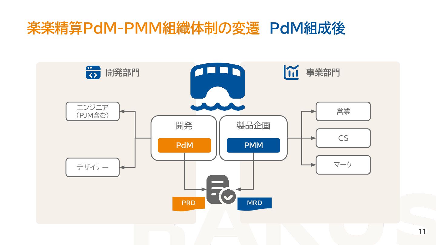 楽楽精算PdM-PMM組織体制の変遷 PdM組成前 10 製品企画 エンジニア (PJM含む) デザイナー 営業 マーケ CS MRD
