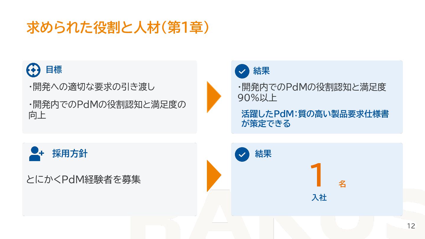 求められた役割と人材(第1章) 12 目標 結果 ・開発への適切な要求の引き渡し ・開発内でのPdMの役割認知と満足度の 向上 採用方針 とにかくPdM経験者を募集 結果