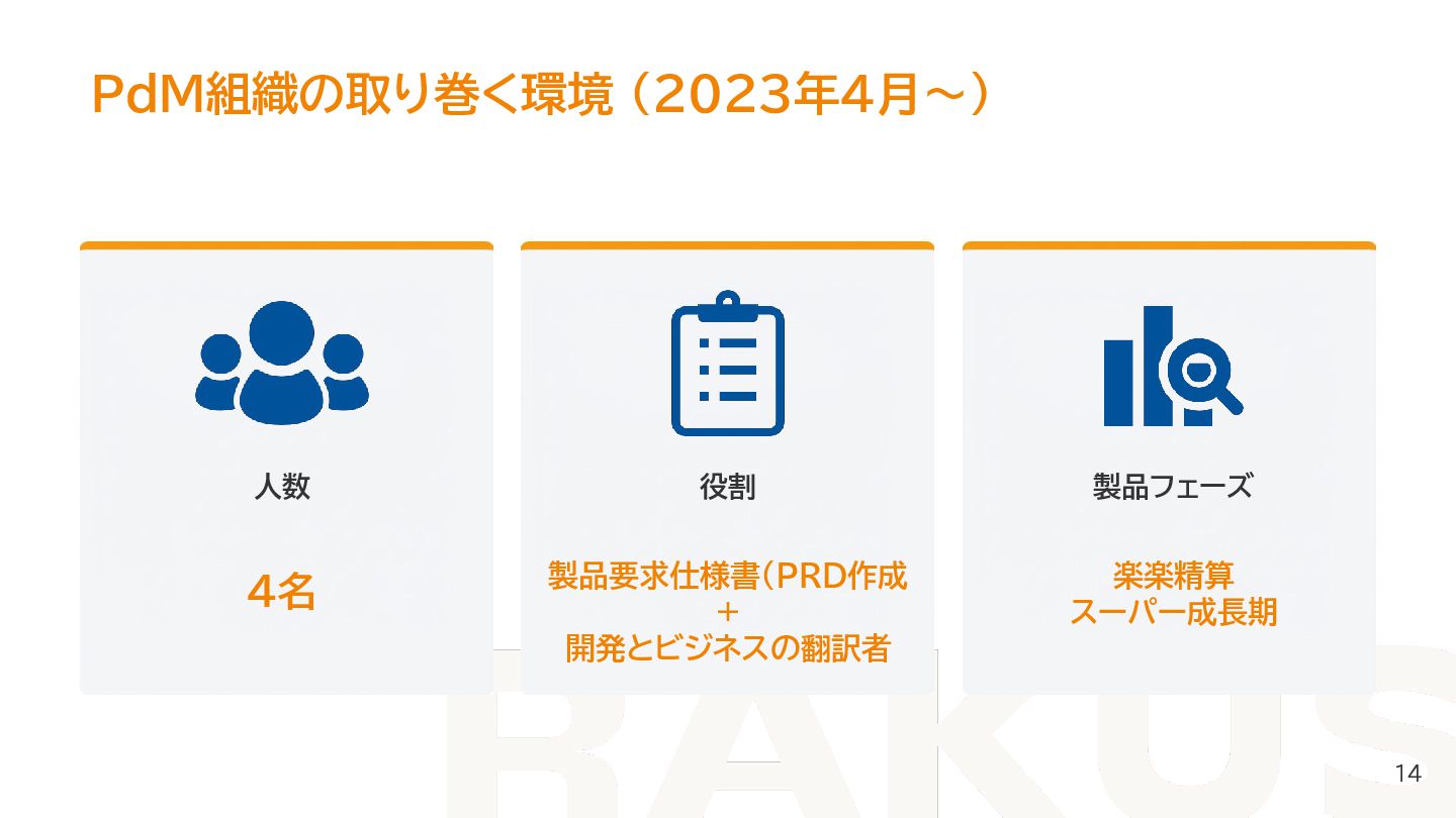 PdM組織の取り巻く環境 (2023年4月〜) 14 人数 4名 役割 製品要求仕様書(PRD作成 + 開発とビジネスの翻訳者 製品フェーズ