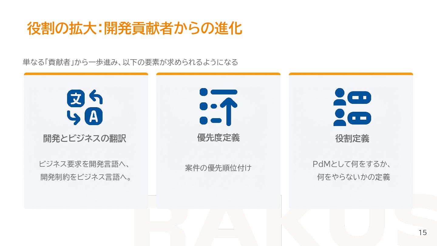 役割の拡大:開発貢献者からの進化 15 単なる「貢献者」から一歩進み、以下の要素が求められるようになる 開発とビジネスの翻訳 ビジネス要求を開発言語へ、 開発制約をビジネス言語へ。 優先度定義 案件の優先順位付け 役割定義 PdMとして何をするか、