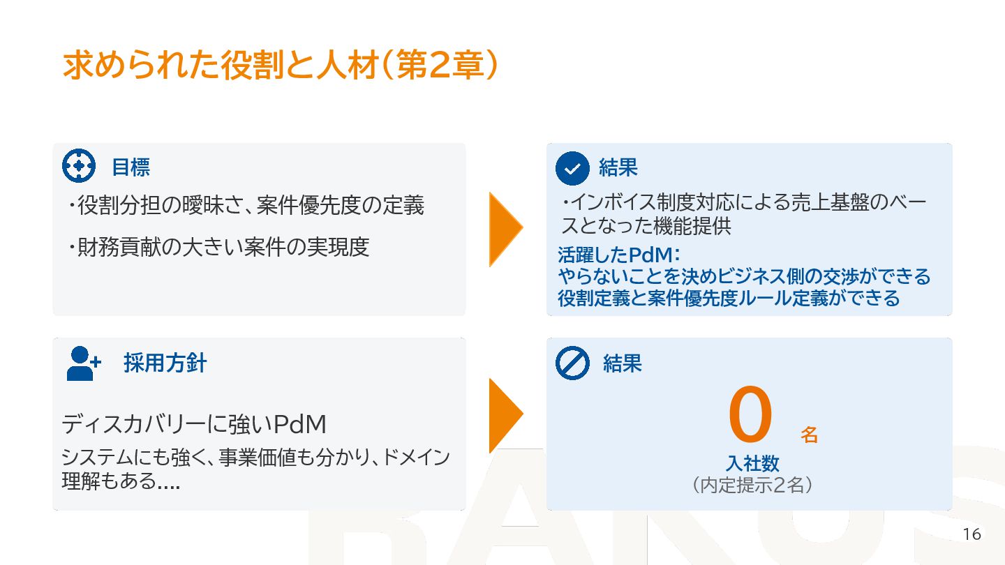 (内定提示2名) ・インボイス制度対応による売上基盤のベー スとなった機能提供 活躍したPdM: やらないことを決めビジネス側の交渉ができる 役割定義と案件優先度ルール定義ができる 0 名 システムにも強く、事業価値も分かり、ドメイン 理解もある....