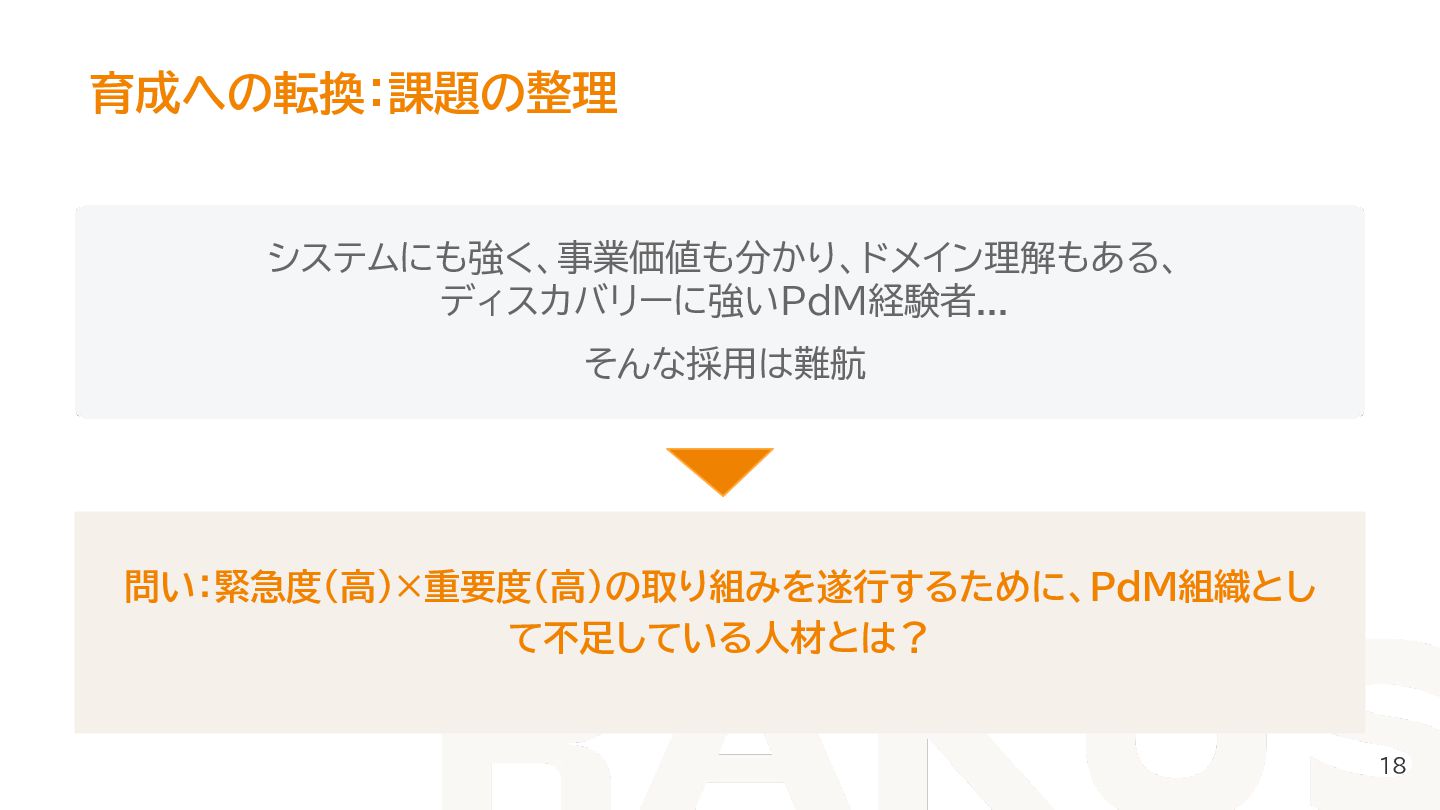 育成への転換:課題の整理 18 システムにも強く、事業価値も分かり、ドメイン理解もある、 ディスカバリーに強いPdM経験者... そんな採用は難航 問い:緊急度(高)×重要度(高)の取り組みを遂行するために、PdM組織とし て不足している人材とは?