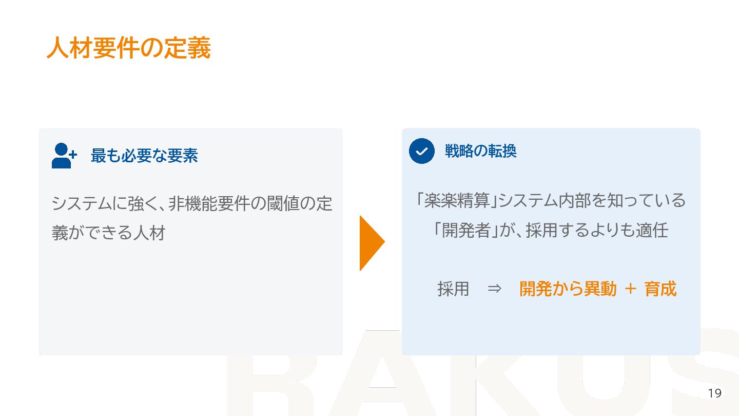 人材要件の定義 19 最も必要な要素 戦略の転換 システムに強く、非機能要件の閾値の定 義ができる人材 採用 ⇒ 開発から異動 +