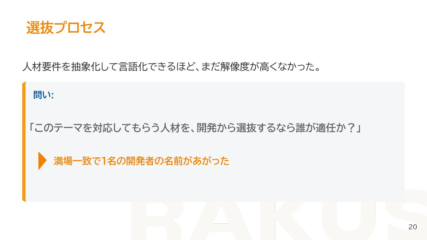 選抜プロセス 20 人材要件を抽象化して言語化できるほど、まだ解像度が高くなかった。 問い: 「このテーマを対応してもらう人材を、開発から選抜するなら誰が適任か?」 満場一致で1名の開発者の名前があがった
