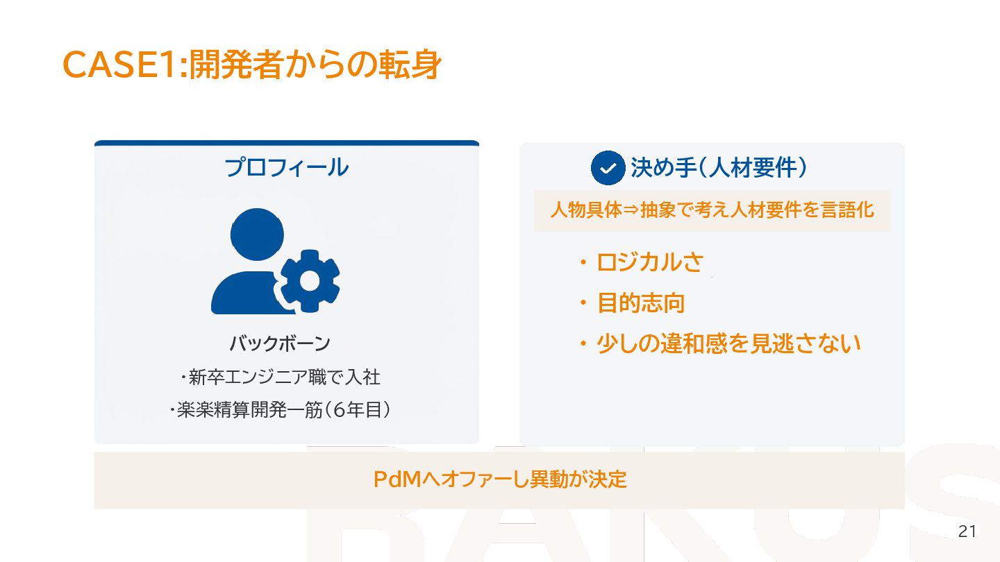 CASE1:開発者からの転身 21 決め手(人材要件) プロフィール バックボーン ・新卒エンジニア職で入社 ・楽楽精算開発一筋(6年目) ・ ロジカルさ ・